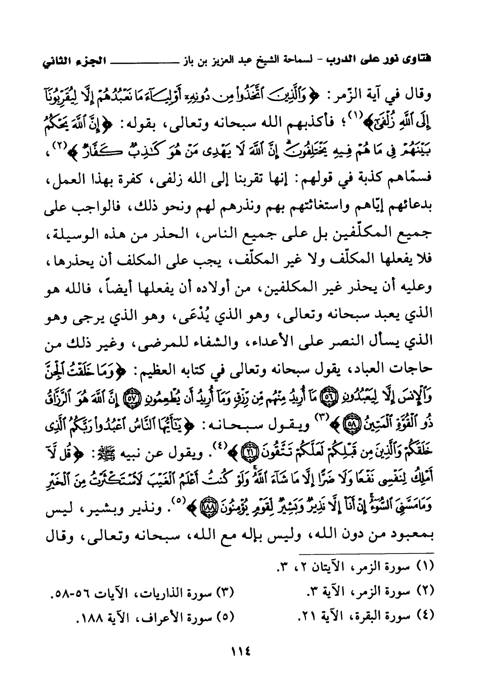 وقال في آية الزمر: {وَالَّذِينَ اتَّخَذُوا مِنْ دُونِهِ أَوْلِيَاءَ مَا نَعْبُدُهُمْ إِلَّا لِيُقَرِّبُونَا إِلَى اللَّهِ زُلْفَى} (¬1)؛ فأكذبهم الله سبحانه وتعالى، بقوله: {إِنَّ اللَّهَ يَحْكُمُ بَيْنَهُمْ فِي مَا هُمْ فِيهِ يَخْتَلِفُونَ إِنَّ اللَّهَ لَا يَهْدِي مَنْ هُوَ كَاذِبٌ كَفَّارٌ} (¬2)، فسماهم كذبة في قولهم: إنها تقربنا إلى الله زلفى، كفرة بهذا العمل، بدعائهم إياهم واستغاثتهم بهم ونذرهم لهم ونحو ذلك، فالواجب على جميع المكلفين بل على جميع الناس، الحذر من هذه الوسيلة، فلا يفعلها المكلف ولا غير المكلف، يجب على المكلف أن يحذرها، وعليه أن يحذر غير المكلفين، من أولاده أن يفعلها أيضا، فالله هو الذي يعبد سبحانه وتعالى، وهو الذي يدعى، وهو الذي يرجى وهو الذي يسأل النصر على الأعداء، والشفاء للمرضى، وغير ذلك من حاجات العباد، يقول سبحانه وتعالى في كتابه العظيم: {وَمَا خَلَقْتُ الْجِنَّ وَالْإِنْسَ إِلَّا لِيَعْبُدُونِ} (¬3) {مَا أُرِيدُ مِنْهُمْ مِنْ رِزْقٍ وَمَا أُرِيدُ أَنْ يُطْعِمُونِ} (¬4) {إِنَّ اللَّهَ هُوَ الرَّزَّاقُ ذُو الْقُوَّةِ الْمَتِينُ} (¬5)، ويقول سبحانه: {يَا أَيُّهَا النَّاسُ اعْبُدُوا رَبَّكُمُ الَّذِي خَلَقَكُمْ وَالَّذِينَ مِنْ قَبْلِكُمْ لَعَلَّكُمْ تَتَّقُونَ} (¬6)، ويقول عن نبيه - صلى الله عليه وسلم -: {قُلْ لَا أَمْلِكُ لِنَفْسِي نَفْعًا وَلَا ضَرًّا إِلَّا مَا شَاءَ اللَّهُ وَلَوْ كُنْتُ أَعْلَمُ الْغَيْبَ لَاسْتَكْثَرْتُ مِنَ الْخَيْرِ وَمَا مَسَّنِيَ السُّوءُ إِنْ أَنَا إِلَّا نَذِيرٌ وَبَشِيرٌ لِقَوْمٍ يُؤْمِنُونَ} (¬7). ونذير وبشير، ليس بمعبود من دون الله، وليس بإله مع الله، سبحانه وتعالى، وقال