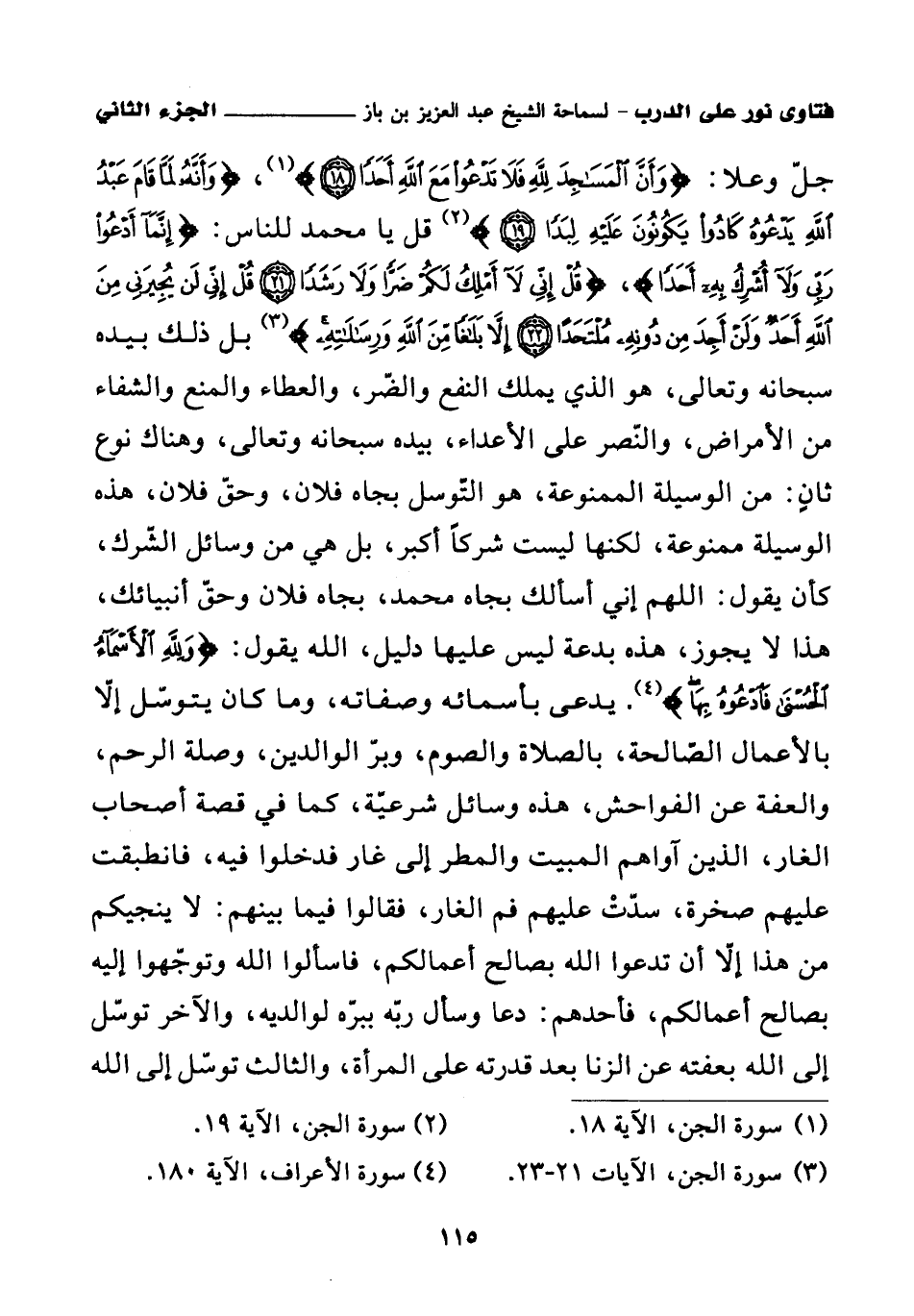 جل وعلا: {وَأَنَّ الْمَسَاجِدَ لِلَّهِ فَلَا تَدْعُوا مَعَ اللَّهِ أَحَدًا} (¬1)، {وَأَنَّهُ لَمَّا قَامَ عَبْدُ اللَّهِ يَدْعُوهُ كَادُوا يَكُونُونَ عَلَيْهِ لِبَدًا} (¬2) قل يا محمد للناس: {إِنَّمَا أَدْعُو رَبِّي وَلَا أُشْرِكُ بِهِ أَحَدًا} (¬3)، {قُلْ إِنِّي لَا أَمْلِكُ لَكُمْ ضَرًّا وَلَا رَشَدًا} (¬4) {قُلْ إِنِّي لَنْ يُجِيرَنِي مِنَ اللَّهِ أَحَدٌ وَلَنْ أَجِدَ مِنْ دُونِهِ مُلْتَحَدًا} (¬5) {إِلَّا بَلَاغًا مِنَ اللَّهِ وَرِسَالَاتِهِ} (¬6) بل ذلك بيده سبحانه وتعالى، هو الذي يملك النفع والضر، والعطاء والمنع والشفاء من الأمراض، والنصر على الأعداء، بيده سبحانه وتعالى، وهناك نوع ثان: من الوسيلة الممنوعة، هو التوسل بجاه فلان، وحق فلان، هذه الوسيلة ممنوعة، لكنها ليست شركا أكبر، بل هي من وسائل الشرك، كأن يقول: اللهم إني أسألك بجاه محمد، بجاه فلان وحق أنبيائك، هذا لا يجوز، هذه بدعة ليس عليها دليل، الله يقول: {وَلِلَّهِ الْأَسْمَاءُ الْحُسْنَى فَادْعُوهُ بِهَا} (¬7) يدعى بأسمائه وصفاته، وما كان يتوسل إلا بالأعمال الصالحة، بالصلاة والصوم، وبر الوالدين، وصلة الرحم، والعفة عن الفواحش، هذه وسائل شرعية، كما في قصة أصحاب الغار، الذين آواهم المبيت والمطر إلى غار فدخلوا فيه، فانطبقت عليهم صخرة، سدت عليهم فم الغار، فقالوا فيما بينهم: لا ينجيكم من هذا إلا أن تدعوا الله بصالح أعمالكم، فاسألوا الله وتوجهوا إليه بصالح أعمالكم، فأحدهم: دعا وسأل ربه ببره لوالديه، والآخر توسل إلى الله بعفته عن الزنا بعد قدرته على المرأة، والثالث توسل إلى الله
