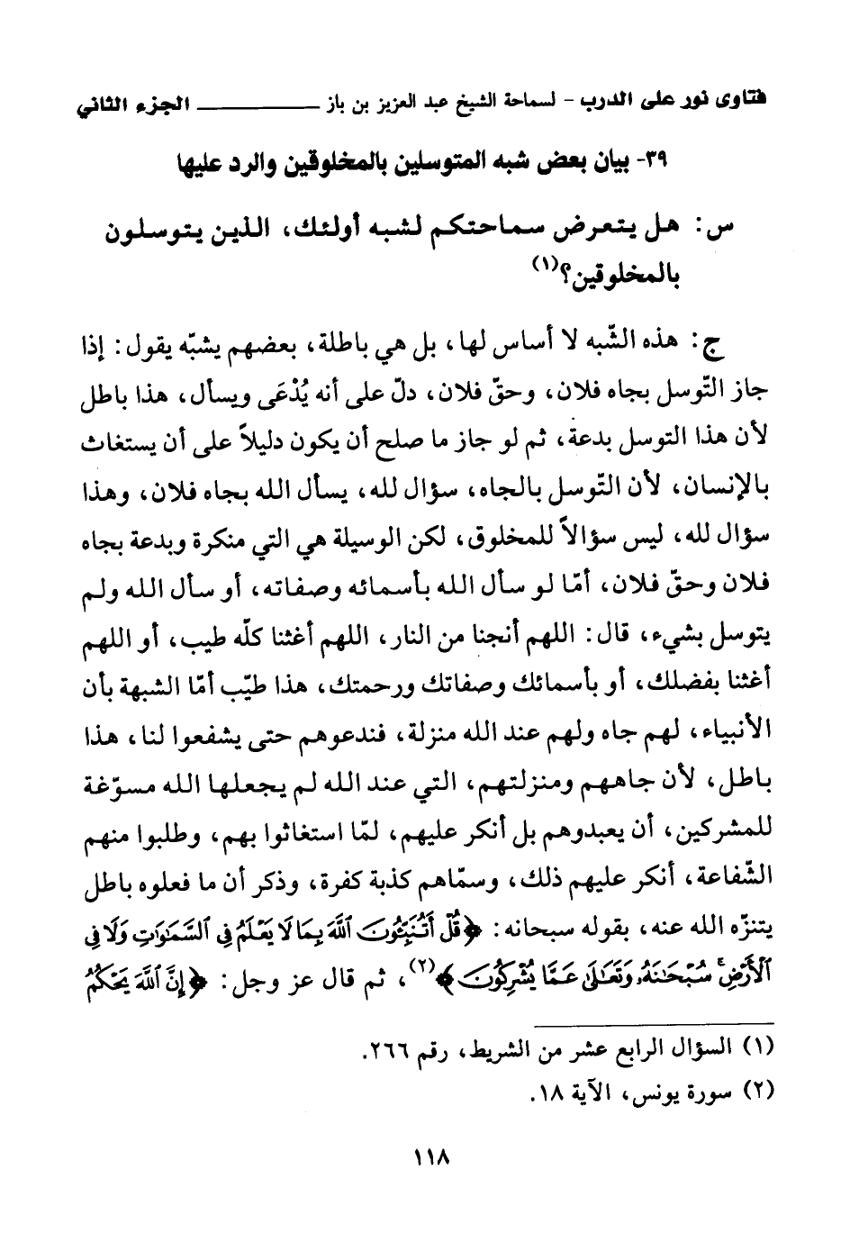 ج: هذه الشبه لا أساس لها، بل هي باطلة، بعضهم يشبه يقول: إذا جاز التوسل بجاه فلان، وحق فلان، دل على أنه يدعى ويسأل، هذا باطل لأن هذا التوسل بدعة، ثم لو جاز ما صلح أن يكون دليلا على أن يستغاث بالإنسان، لأن التوسل بالجاه، سؤال لله، يسأل الله بجاه فلان، وهذا سؤال لله، ليس سؤالا للمخلوق، لكن الوسيلة هي التي منكرة وبدعة بجاه فلان وحق فلان، أما لو سأل الله بأسمائه وصفاته، أو سأل الله ولم يتوسل بشيء، قال: اللهم أنجنا من النار، اللهم أغثنا كله طيب، أو اللهم أغثنا بفضلك، أو بأسمائك وصفاتك ورحمتك، هذا طيب أما الشبهة بأن الأنبياء لهم جاه ولهم عند الله منزلة، فندعوهم حتى يشفعوا لنا، هذا باطل، لأن جاههم ومنزلتهم، التي عند الله لم يجعلها الله مسوغة للمشركين أن يعبدوهم بل أنكر عليهم لما استغاثوا بهم، وطلبوا منهم الشفاعة، أنكر عليهم ذلك، وسماهم كذبة كفرة، وذكر أن ما فعلوه باطل يتنزه الله عنه، بقوله سبحانه: {قُلْ أَتُنَبِّئُونَ اللَّهَ بِمَا لَا يَعْلَمُ فِي السَّمَاوَاتِ وَلَا فِي الْأَرْضِ سُبْحَانَهُ وَتَعَالَى عَمَّا يُشْرِكُونَ} (¬2)، ثم قال عز وجل: {إِنَّ اللَّهَ يَحْكُمُ بَيْنَهُمْ فِي مَا هُمْ فِيهِ يَخْتَلِفُونَ إِنَّ اللَّهَ لَا يَهْدِي مَنْ هُوَ كَاذِبٌ كَفَّارٌ} (¬3)
