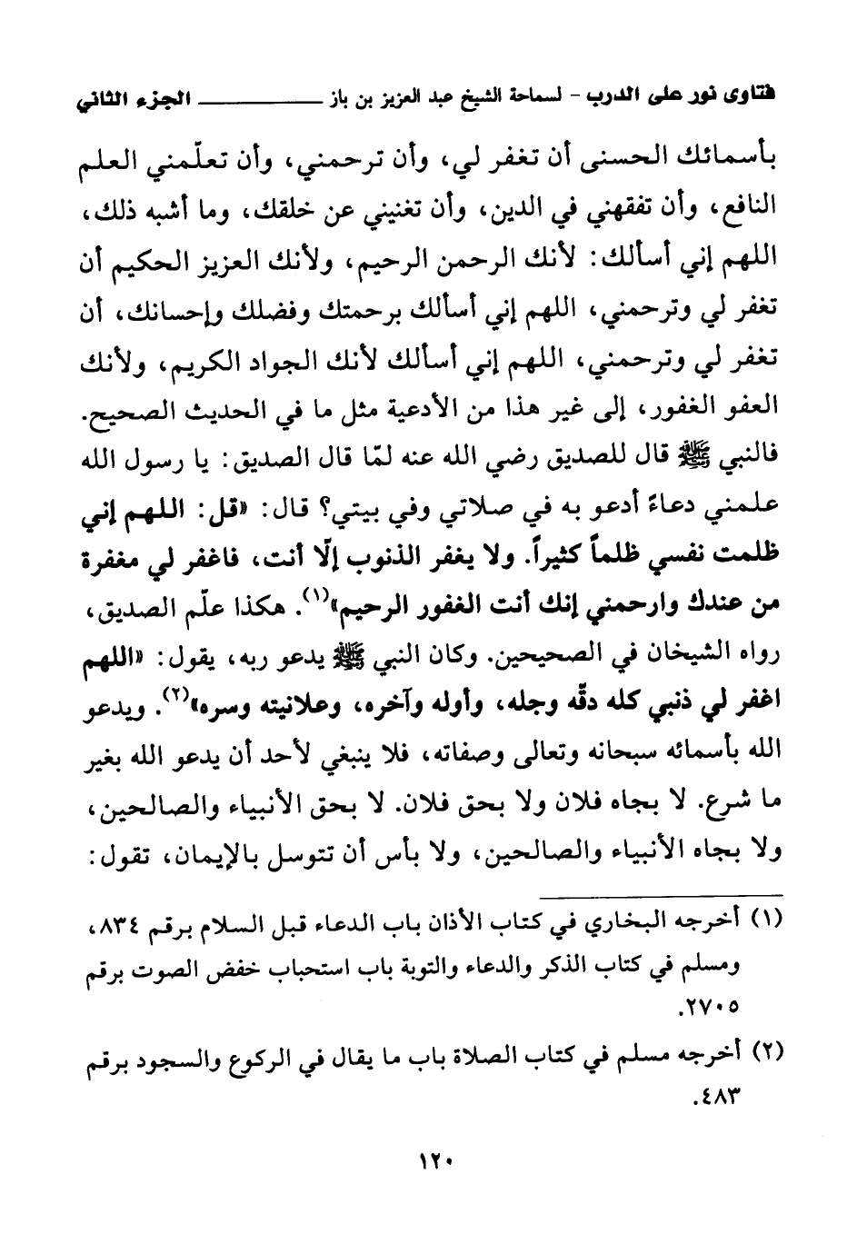 بأسمائك الحسنى أن تغفر لي، وأن ترحمني، وأن تعلمني العلم النافع، وأن تفقهني في الدين، وأن تغنيني عن خلقك، وما أشبه ذلك، اللهم إني أسألك: لأنك الرحمن الرحيم، ولأنك العزيز الحكيم أن تغفر لي وترحمني، اللهم إني أسألك برحمتك وفضلك وإحسانك، أن تغفر لي وترحمني، اللهم إني أسألك لأنك الجواد الكريم، ولأنك العفو الغفور، إلى غير هذا من الأدعية مثل ما في الحديث الصحيح؛ فالنبي - صلى الله عليه وسلم - قال للصديق رضي الله عنه لما قال الصديق: «يا رسول الله علمني دعاء أدعو به في صلاتي وفي بيتي؟ قال: " قل: اللهم إني ظلمت نفسي ظلما كثيرا، ولا يغفر الذنوب إلا أنت، فاغفر لي مغفرة من عندك وارحمني إنك أنت الغفور الرحيم (¬1)». هكذا علم الصديق، رواه الشيخان في الصحيحين، وكان النبي - صلى الله عليه وسلم - يدعو ربه، يقول: «اللهم اغفر لي ذنبي كله دقه وجله، وأوله وآخره، وعلانيته وسره (¬2)». ويدعو الله بأسمائه سبحانه وتعالى وصفاته، فلا ينبغي لأحد أن يدعو الله بغير ما شرع، لا بجاه فلان ولا بحق فلان؛ لا بحق الأنبياء والصالحين، ولا بجاه الأنبياء والصالحين، ولا بأس أن تتوسل بالإيمان، تقول: