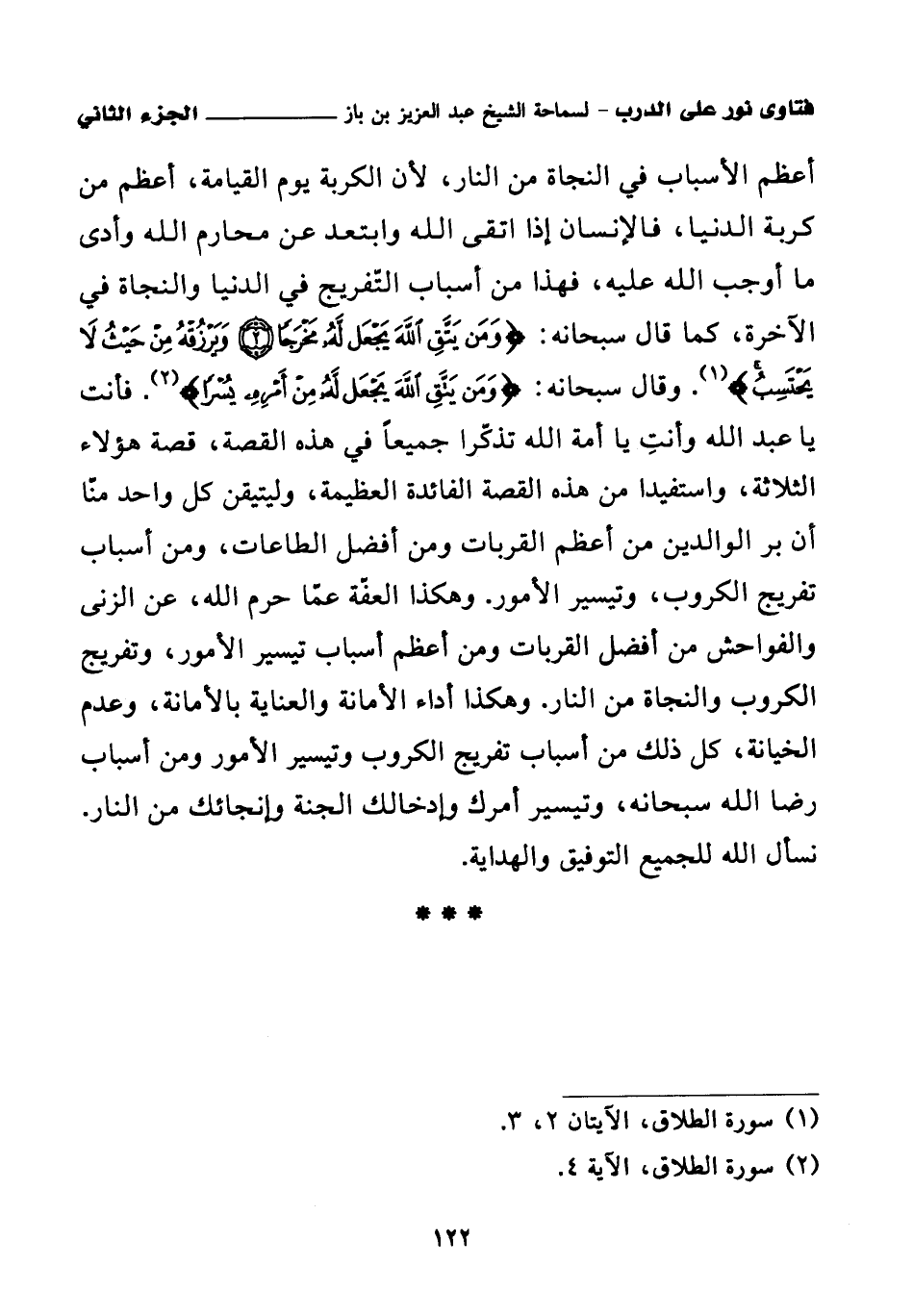 أعظم الأسباب في النجاة من النار، لأن الكربة يوم القيامة، أعظم من كربة الدنيا، فالإنسان إذا اتقى الله وابتعد عن محارم الله وأدى ما أوجب الله عليه، فهذا من أسباب التفريج في الدنيا والنجاة في الآخرة، كما قال سبحانه: {وَمَنْ يَتَّقِ اللَّهَ يَجْعَلْ لَهُ مَخْرَجًا} (¬1) {وَيَرْزُقْهُ مِنْ حَيْثُ لَا يَحْتَسِبُ} (¬2)، وقال سبحانه: {وَمَنْ يَتَّقِ اللَّهَ يَجْعَلْ لَهُ مِنْ أَمْرِهِ يُسْرًا} (¬3)، فأنت يا عبد الله وأنت يا أمة الله تذكرا جميعا في هذه القصة، قصة هؤلاء الثلاثة، واستفيدا من هذه القصة الفائدة العظيمة، وليتيقن كل واحد منا أن بر الوالدين من أعظم القربات ومن أفضل الطاعات، ومن أسباب تفريج الكروب، وتيسير الأمور. وهكذا العفة عما حرم الله، عن الزنى والفواحش من أفضل القربات ومن أعظم أسباب تيسير الأمور، وتفريج الكروب والنجاة من النار. وهكذا أداء الأمانة والعناية بالأمانة، وعدم الخيانة، كل ذلك من أسباب تفريج الكروب وتيسير الأمور ومن أسباب رضا الله سبحانه، وتيسير أمرك وإدخالك الجنة وإنجائك من النار. نسأل الله للجميع التوفيق والهداية.