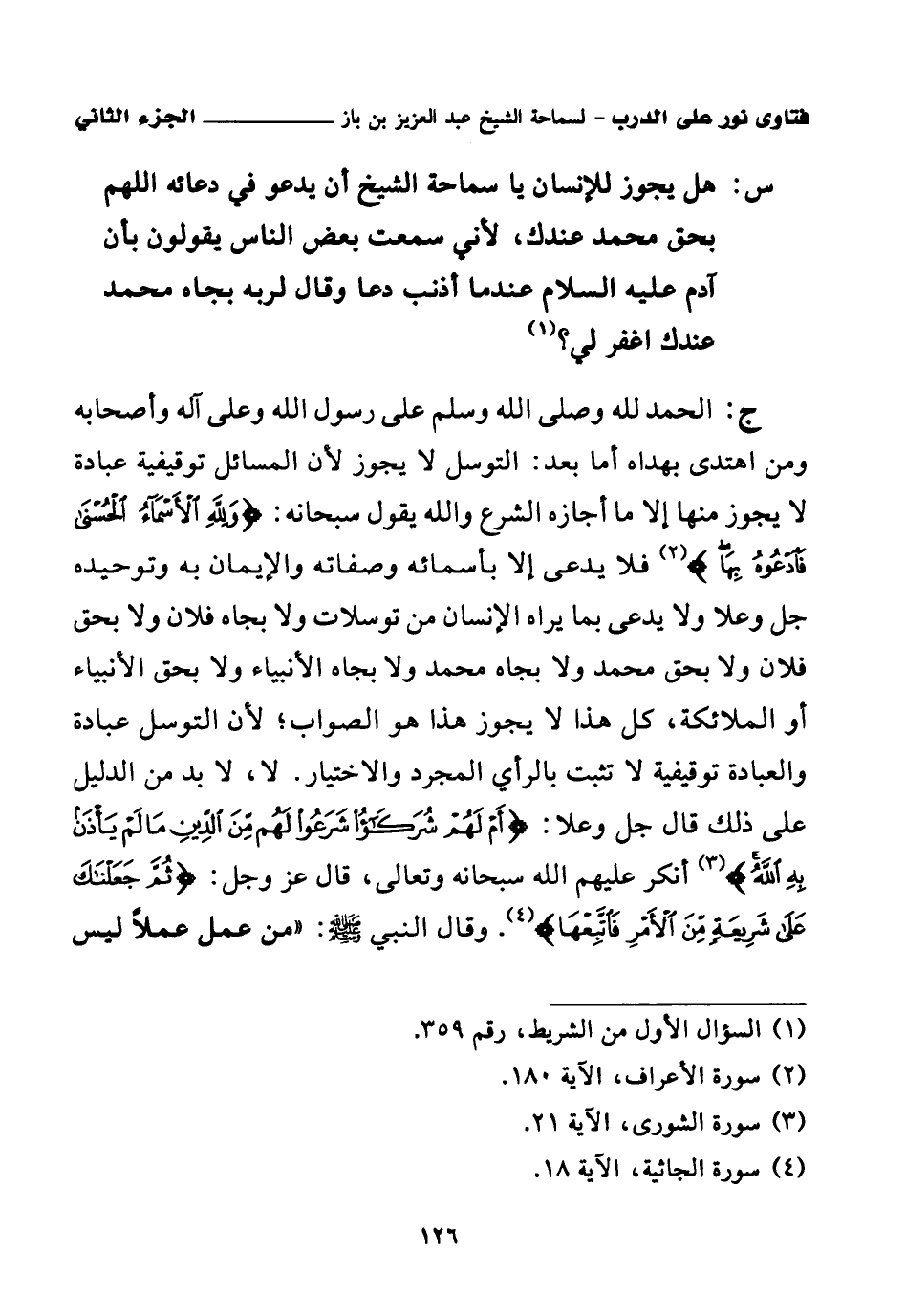 س: هل يجوز للإنسان يا سماحة الشيخ أن يدعو في دعائه اللهم بحق محمد عندك، لأني سمعت بعض الناس يقولون بأن آدم عليه السلام عندما أذنب دعا وقال لربه بجاه محمد عندك اغفر لي؟ (¬1)
