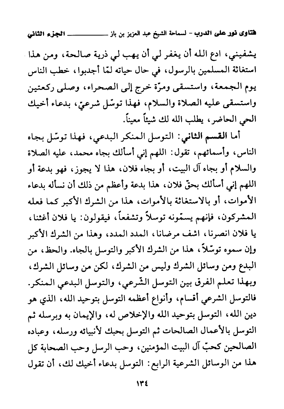 أما القسم الثاني: التوسل المنكر البدعي، فهذا توسل بجاه الناس، وأسمائهم، تقول: اللهم إني أسألك بجاه محمد، عليه الصلاة والسلام أو بجاه آل البيت، أو بجاه فلان، هذا لا يجوز، فهو بدعة، أو اللهم إني أسألك بحق فلان، هذا بدعة وأعظم من ذلك أن نسأله بدعاء الأموات، أو بالاستغاثة بالأموات، هذا من الشرك الأكبر كما فعله المشركون، فإنهم يسمونه توسلا وتشفعا، فيقولون: يا فلان أغثنا، يا فلان انصرنا، اشف مرضانا، المدد المدد، وهذا من الشرك الأكبر وإن سموه توسلا، هذا من الشرك الأكبر؛ والتوسل بالجاه والحظ من البدع ومن وسائل الشرك وليس من الشرك، لكن من وسائل الشرك، وبهذا تعلم الفرق بين التوسل الشرعي، والتوسل البدعي المنكر. فالتوسل الشرعي أقسام وأنواع، أعظمه التوسل بتوحيد الله، الذي هو دين الله، التوسل بتوحيد الله والإخلاص له، والإيمان به وبرسله ثم التوسل بالأعمال الصالحات ثم التوسل بحبك لأنبيائه ورسله، وعباده الصالحين كحب آل البيت المؤمنين، وحب الرسل وحب الصحابة كل هذا من الوسائل الشرعية؛ الرابع: التوسل بدعاء أخيك لك، أن تقول