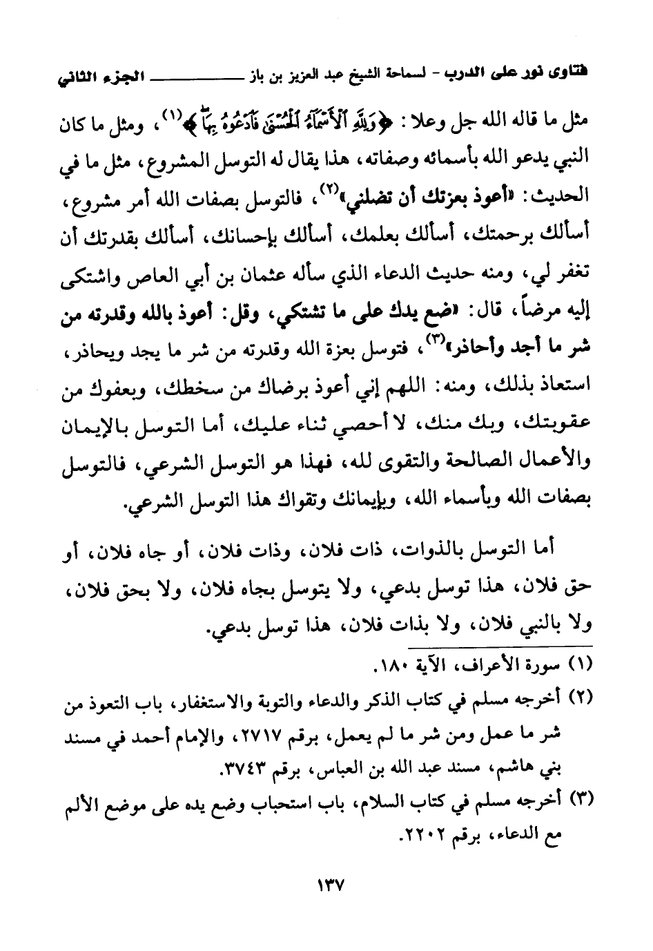 مثل ما قاله الله جل وعلا: {وَلِلَّهِ الْأَسْمَاءُ الْحُسْنَى فَادْعُوهُ بِهَا} (¬1)، ومثل ما كان النبي يدعو الله بأسمائه وصفاته، هذا يقال له التوسل المشروع، مثل ما في الحديث: «أعوذ بعزتك أن تضلني (¬2)»، فالتوسل بصفات الله أمر مشروع، أسألك برحمتك، أسألك بعلمك، أسألك بإحسانك، أسألك بقدرتك أن تغفر لي، ومنه حديث الدعاء الذي سأله عثمان بن أبي العاص واشتكى إليه مرضا، قال: «ضع يدك على ما تشتكي، وقل: أعوذ بالله وقدرته من شر ما أجد وأحاذر (¬3)»، فتوسل بعزة الله وقدرته من شر ما يجد ويحاذر، استعاذ بذلك، ومنه: اللهم إني أعوذ برضاك من سخطك، وبعفوك من عقوبتك، وبك منك، لا أحصي ثناء عليك، أما التوسل بالإيمان والأعمال الصالحة والتقوى لله، فهذا هو التوسل الشرعي، فالتوسل بصفات الله وبأسماء الله، وبإيمانك وتقواك هذا التوسل الشرعي.