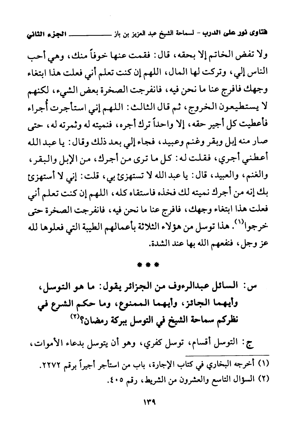 ولا تفض الخاتم إلا بحقه، قال: فقمت عنها خوفا منك، وهي أحب الناس إلي، وتركت لها المال، اللهم إن كنت تعلم أني فعلت هذا ابتغاء وجهك فافرج عنا ما نحن فيه، فانفرجت الصخرة بعض الشيء، لكنهم لا يستطيعون الخروج، ثم قال الثالث: اللهم إني استأجرت أجراء فأعطيت كل أجير حقه، إلا واحدا ترك أجره، فنميته له وثمرته له، حتى صار منه إبل وبقر وغنم وعبيد، فجاء إلي بعد ذلك وقال: يا عبد الله أعطني أجري، فقلت له: كل ما ترى من أجرك، من الإبل والبقر، والغنم، والعبيد، قال: يا عبد الله لا تستهزئ بي، قلت: إني لا أستهزئ بك إنه من أجرك نميته لك فخذه فاستاقه كله، اللهم إن كنت تعلم أني فعلت هذا ابتغاء وجهك، فافرج عنا ما نحن فيه، فانفرجت الصخرة حتى خرجوا. (¬1) هذا توسل من هؤلاء الثلاثة بأعمالهم الطيبة التي فعلوها لله عز وجل، فنفعهم الله بها عند الشدة.