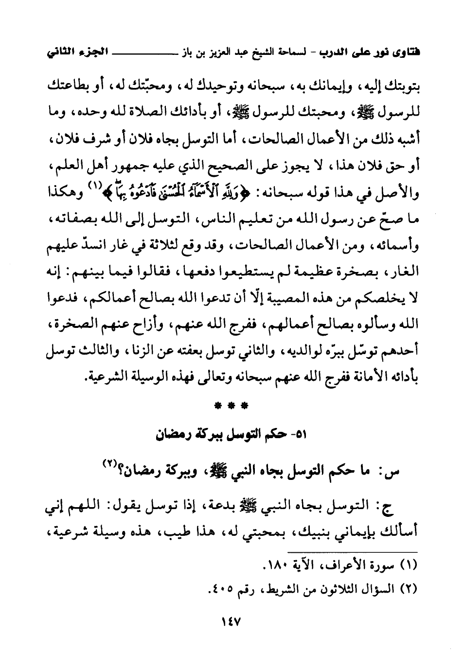 بتوبتك إليه، وإيمانك به، سبحانه وتوحيدك له، ومحبتك له، أو بطاعتك للرسول - صلى الله عليه وسلم -، ومحبتك للرسول - صلى الله عليه وسلم -، أو بأدائك الصلاة لله وحده، وما أشبه ذلك من الأعمال الصالحات، أما التوسل بجاه فلان أو شرف فلان، أو حق فلان، هذا لا يجوز على الصحيح الذي عليه جمهور أهل العلم، والأصل في هذا قوله سبحانه: {وَلِلَّهِ الْأَسْمَاءُ الْحُسْنَى فَادْعُوهُ بِهَا} (¬1) وهكذا ما صح عن رسول الله من تعليم الناس التوسل إلى الله بصفاته وأسمائه، ومن الأعمال الصالحات، وقد وقع لثلاثة في غار انسد عليهم الغار، بصخرة عظيمة لم يستطيعوا دفعها، فقالوا فيما بينهم: إنه لا يخلصكم من هذه المصيبة إلا أن تدعوا الله بصالح أعمالكم، فدعوا الله وسألوه بصالح أعمالهم، ففرج الله عنهم، وأزاح عنهم الصخرة، أحدهم توسل ببره لوالديه، والثاني توسل بعفته عن الزنا، والثالث توسل بأدائه الأمانة ففرج الله عنهم سبحانه وتعالى، فهذه الوسيلة الشرعية.