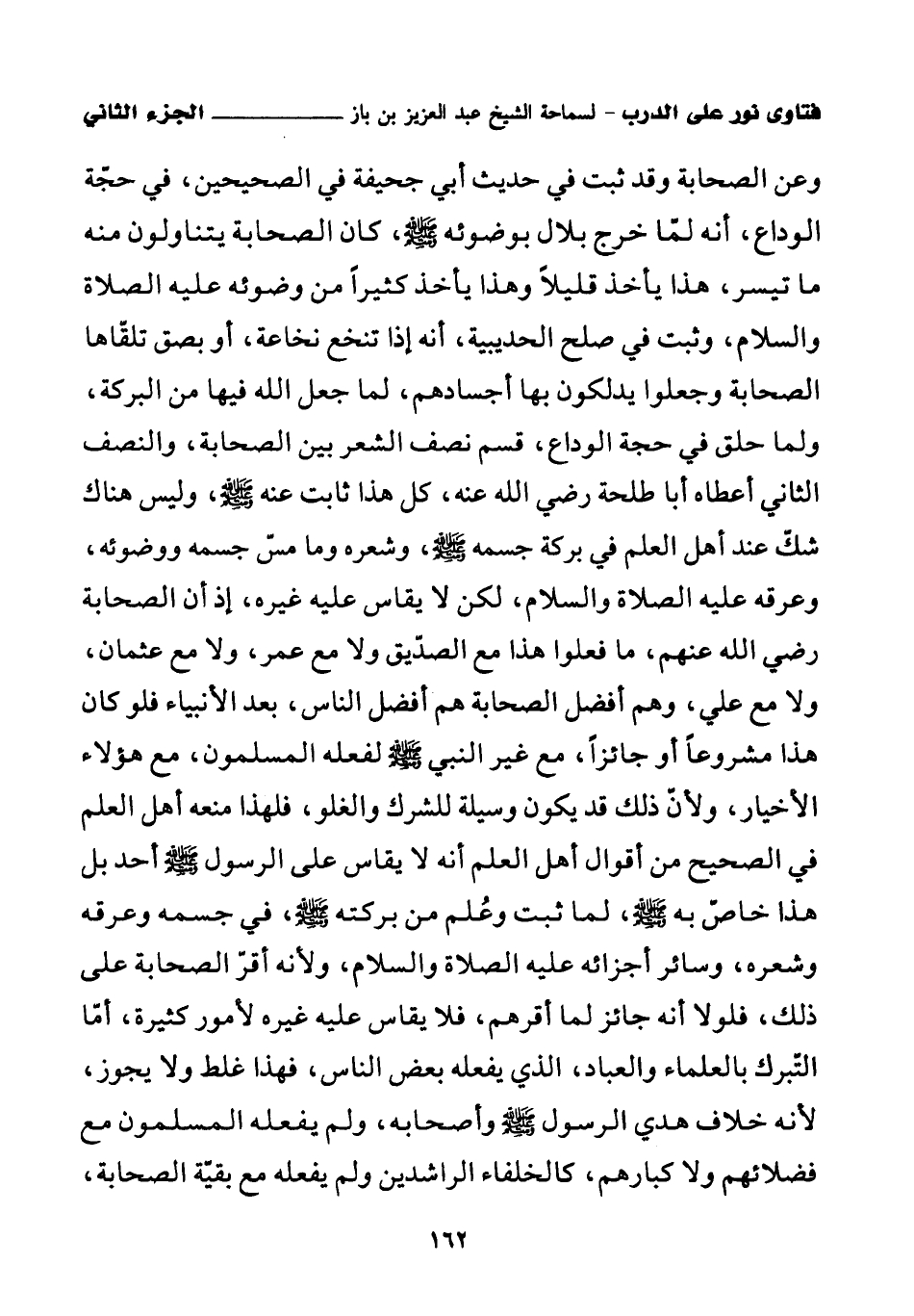 وعن الصحابة، وقد ثبت في حديث أبي جحيفة في الصحيحين، في حجة الوداع، أنه لما خرج بلال بوضوئه صلى الله عليه وسلم، كان الصحابة يتناولون منه ما تيسر، هذا يأخذ قليلا وهذا يأخذ كثيرا من وضوئه عليه الصلاة والسلام، وثبت في صلح الحديبية، أنه إذا تنخع نخاعة أو بصق تلقاها الصحابة وجعلوا يدلكون بها أجسادهم، لما جعل الله فيها من البركة، ولما حلق في حجة الوداع، قسم نصف الشعر بين الصحابة، والنصف الثاني أعطاه أبا طلحة رضي الله عنه، كل هذا ثابت عنه صلى الله عليه وسلم، وليس هناك شك عند أهل العلم في بركة جسمه صلى الله عليه وسلم، وشعره وما مس جسمه ووضوئه، وعرقه عليه الصلاة والسلام.
