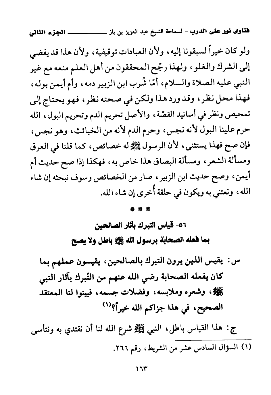 ولو كان خيرا لسبقونا إليه، ولأن العبادات توقيفية، ولأن هذا قد يفضي إلى الشرك والغلو، ولهذا رجح المحققون من أهل العلم منعه مع غير النبي عليه الصلاة والسلام، أما شرب ابن الزبير دمه، وأم أيمن بوله، فهذا محل نظر، وقد ورد هذا ولكن في صحته نظر، فهو يحتاج إلى تمحيص ونظر في أسانيد القصة، والأصل تحريم الدم وتحريم البول، الله حرم علينا البول لأنه نجس، وحرم الدم لأنه من الخبائث، وهو نجس، فإن صح فهذا يستثنى، لأن الرسول صلى الله عليه وسلم له خصائص، كما قلنا في العرق ومسألة الشعر، ومسألة البصاق هذا خاص به، فهكذا إذا صح حديث أم أيمن، وصح حديث ابن الزبير، صار من الخصائص، وسوف نبحثه إن شاء الله، ونعتني به ويكون في حلقة أخرى إن شاء الله.