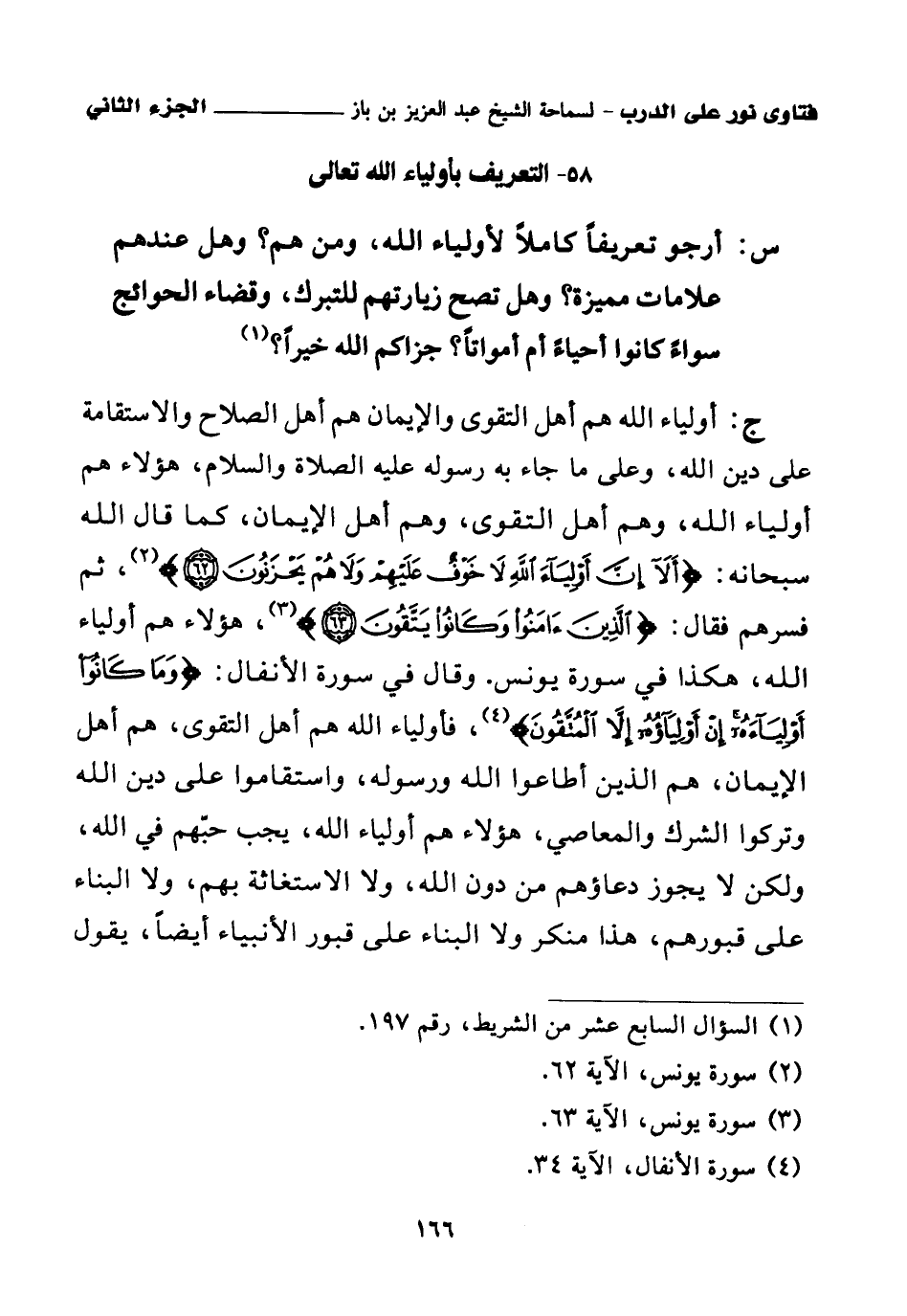 ج: أولياء الله هم أهل التقوى والإيمان هم أهل الصلاح والاستقامة على دين الله، وعلى ما جاء به رسوله عليه الصلاة والسلام، هؤلاء هم أولياء الله، وهم أهل التقوى، وهم أهل الإيمان، كما قال الله سبحانه: {أَلَا إِنَّ أَوْلِيَاءَ اللَّهِ لَا خَوْفٌ عَلَيْهِمْ وَلَا هُمْ يَحْزَنُونَ} (¬2)، ثم فسرهم فقال: {الَّذِينَ آمَنُوا وَكَانُوا يَتَّقُونَ} (¬3)، هؤلاء هم أولياء الله، هكذا في سورة يونس. وقال في سورة الأنفال: {وَمَا كَانُوا أَوْلِيَاءَهُ إِنْ أَوْلِيَاؤُهُ إِلَّا الْمُتَّقُونَ} (¬4)، فأولياء الله هم أهل التقوى، هم أهل الإيمان، هم الذين أطاعوا الله ورسوله، واستقاموا على دين الله وتركوا الشرك والمعاصي، هؤلاء هم أولياء الله، يجب حبهم في الله، ولكن لا يجوز دعاؤهم من دون الله، ولا الاستغاثة بهم، ولا البناء على قبورهم، هذا منكر، ولا البناء على قبور الأنبياء أيضا، يقول