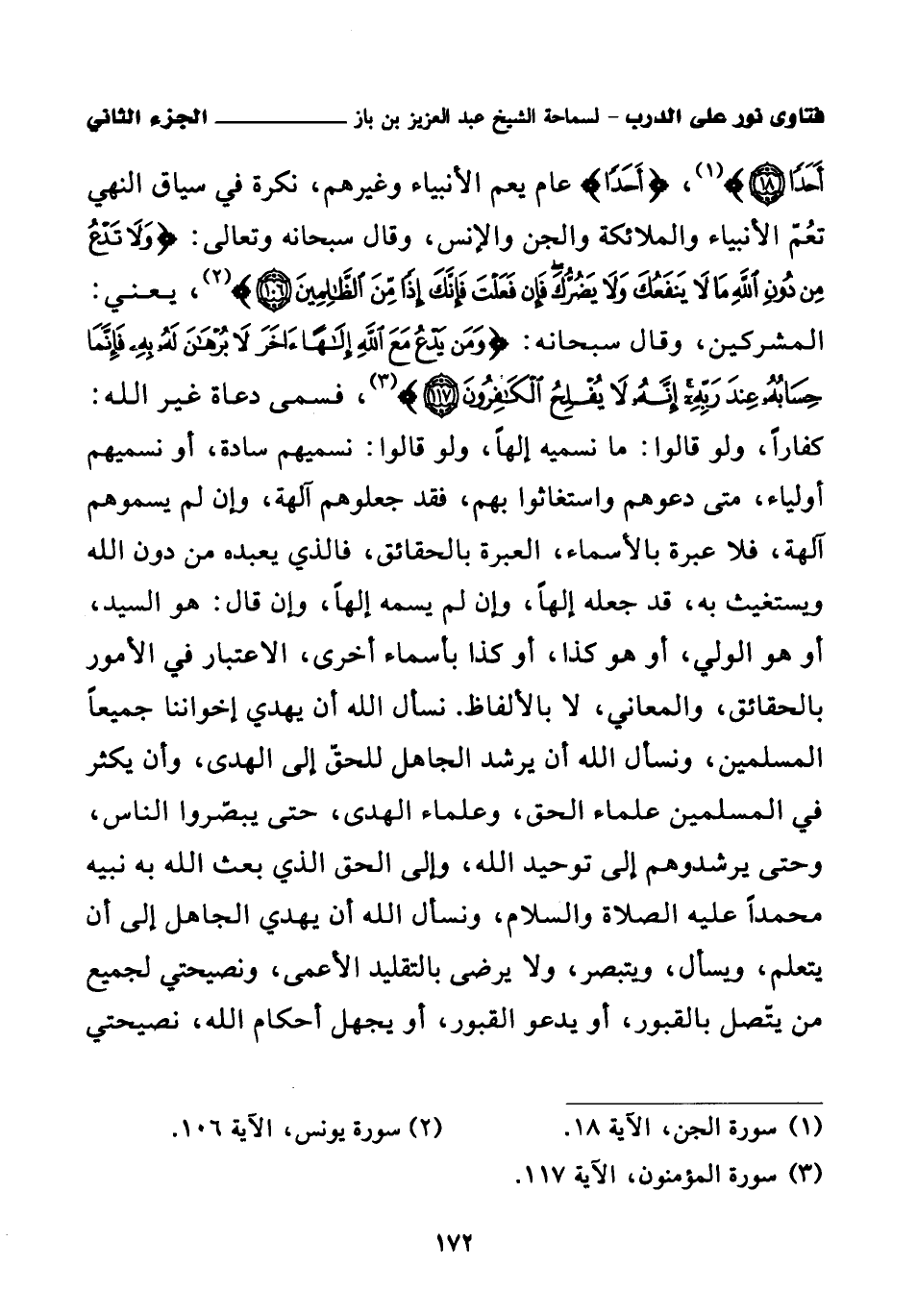 (أحدا) عام يعم الأنبياء وغيرهم، نكرة في سياق النهي تعم الأنبياء والملائكة والجن والإنس، وقال سبحانه وتعالى: {وَلَا تَدْعُ مِنْ دُونِ اللَّهِ مَا لَا يَنْفَعُكَ وَلَا يَضُرُّكَ فَإِنْ فَعَلْتَ فَإِنَّكَ إِذًا مِنَ الظَّالِمِينَ} (¬1)، يعني: المشركين، وقال سبحانه: {وَمَنْ يَدْعُ مَعَ اللَّهِ إِلَهًا آخَرَ لَا بُرْهَانَ لَهُ بِهِ فَإِنَّمَا حِسَابُهُ عِنْدَ رَبِّهِ إِنَّهُ لَا يُفْلِحُ الْكَافِرُونَ} (¬2)، فسمى دعاة غير الله: كفارا، ولو قالوا: ما نسميه إلها، ولو قالوا: نسميهم سادة، أو نسميهم أولياء، متى دعوهم واستغاثوا بهم، فقد جعلوهم آلهة، وإن لم يسموهم آلهة، فلا عبرة بالأسماء، العبرة بالحقائق، فالذي يعبده من دون الله ويستغيث به، قد جعله إلها، وإن لم يسمه إلها، وإن قال: هو السيد، أو هو الولي، أو هو كذا، أو كذا بأسماء أخرى، الاعتبار في الأمور بالحقائق، والمعاني، لا بالألفاظ. نسأل الله أن يهدي إخواننا جميعا المسلمين، ونسأل الله أن يرشد الجاهل للحق على الهدى، وأن يكثر في المسلمين علماء الحق، وعلماء الهدى، حتى يبصروا الناس، وحتى يرشدوهم إلى توحيد الله، وإلى الحق الذي بعث الله به نبيه محمدا عليه الصلاة والسلام، ونسأل الله أن يهدي الجاهل إلى أن يتعلم، ويسأل، ويتبصر، ولا يرضى بالتقليد الأعمى، ونصيحتي لجميع من يتصل بالقبور، أو يدعو القبور، أو يجهل أحكام الله، نصيحتي