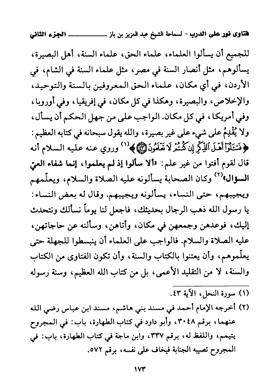 للجميع أن يسألوا العلماء، علماء الحق، علماء السنة، أهل البصيرة، يسألوهم، مثل أنصار السنة في مصر، مثل علماء السنة في الشام، في الأردن، في أي مكان، علماء الحق المعروفين بالسنة والتوحيد، والإخلاص، والبصيرة، وهكذا في كل مكان، في إفريقيا، وفي أوروبا، وفي أمريكا، في كل مكان. الواجب على من جهل الحكم أن يسأل، ولا يقدم على شيء على غير بصيرة، والله يقول سبحانه في كتابه العظيم: {فَاسْأَلُوا أَهْلَ الذِّكْرِ إِنْ كُنْتُمْ لَا تَعْلَمُونَ} (¬1).