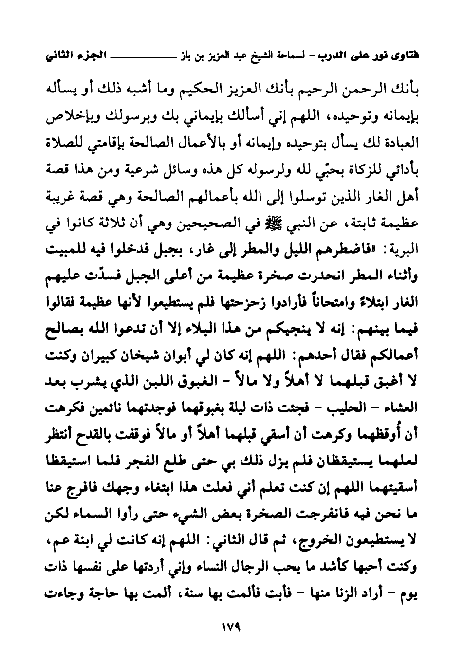 بأنك الرحمن الرحيم بأنك العزيز الحكيم وما أشبه ذلك، أو يسأله بإيمانه وتوحيده، اللهم إني أسألك بإيماني بك وبرسولك وبإخلاص العبادة لك، يسأل بتوحيده وإيمانه أو بالأعمال الصالحة بإقامتي الصلاة بأدائي للزكاة، بحبي لله ولرسوله، كل هذه وسائل شرعية، ومن هذه قصة أهل الغار الذين توسلوا إلى الله بأعمالهم الصالحة وهي قصة غريبة عظيمة ثابتة، عن النبي صلى الله عليه وسلم في الصحيحين وهي «أن ثلاثة كانوا في البرية، فاضطرهم الليل والمطر إلى غار، بجبل فدخلوا فيه للمبيت وأثناء المطر انحدرت صخرة عظيمة من أعلى الجبل فسدت عليهم الغار ابتلاء وامتحانا، فأرادوا زحزحتها فلم يستطيعوا لأنها عظيمة فقالوا فيما بينهم: إنه لا ينجيكم من هذا البلاء إلا أن تدعوا الله بصالح أعمالكم، فقال أحدهم: اللهم إنه كان لي أبوان شيخان كبيران وكنت لا أغبق قبلهما لا أهلا ولا مالا - الغبوق اللبن الذي يشرب بعد العشاء - الحليب - فجئت ذات ليلة بغبوقهما فوجدتهما نائمين فكرهت أن أوقظهما وكرهت أن أسقي قبلهما أهلا أو مالا فوقفت بالقدح أنتظر لعلهما يستيقظان فلم يزل ذلك بي حتى طلع الفجر فلما استيقظا أسقيتهما، اللهم إن كنت تعلم أني فعلت هذا ابتغاء وجهك فأفرج عنا ما نحن فيه فانفرجت الصخرة بعض الشيء حتى رأوا السماء لكن لا يستطيعون الخروج، ثم قال الثاني: اللهم إنه كانت لي ابنة عم، وكنت أحبها كأشد ما يحب الرجال النساء وإني أردتها على نفسها ذات يوم - أراد الزنا منها - فأبت فألمت بها سنة، ألمت بها حاجة وجاءت