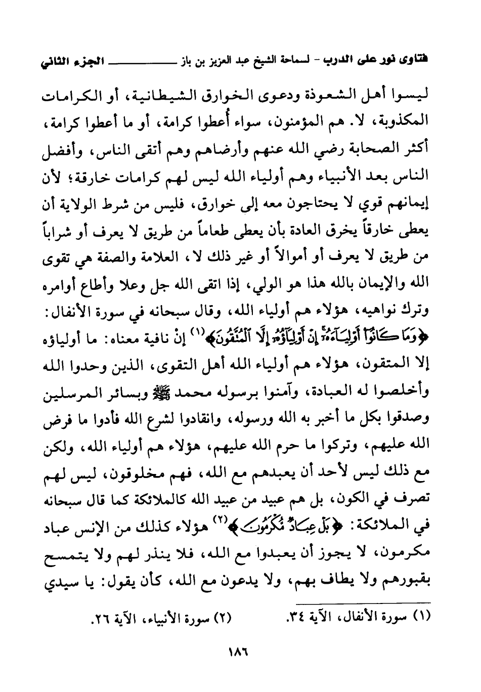 وقال سبحانه وتعالى في سورة الأنفال: {وَمَا كَانُوا أَوْلِيَاءَهُ إِنْ أَوْلِيَاؤُهُ إِلَّا الْمُتَّقُونَ} (¬1) إن نافية معناه: ما أولياؤه إلا المتقون، هؤلاء هم أولياء الله أهل التقوى، الذين وحدوا الله وأخلصوا له العبادة، وآمنوا برسوله محمد صلى الله عليه وسلم وبسائر المرسلين وصدقوا بكل ما أخبر به الله ورسوله، وانقادوا لشرع الله فأدوا ما فرض عليهم، وتركوا ما حرم عليهم، هؤلاء هم أولياء الله، ولكن مع ذلك ليس لأحد أن يعبدهم مع الله، فهم مخلوقون، ليس لهم تصرف في الكون، بل هم عبيد من عبيد الله كالملائكة كما قال سبحانه في الملائكة: {بَلْ عِبَادٌ مُكْرَمُونَ} (¬2) هؤلاء كذلك من الإنس عباد مكرمون، لا يجوز أن يعبدوا مع الله، فلا ينذر لهم ولا يتمسح بقبورهم ولا يطاف بهم، ولا يدعون مع الله، كأن يقول: يا سيدي