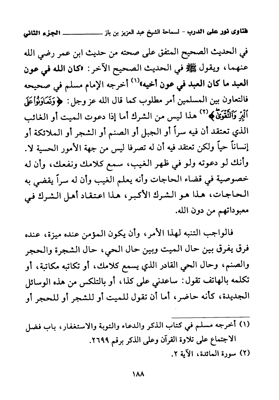 في الحديث الصحيح المتفق على صحته من حديث ابن عمر رضي الله عنهما، ويقول صلى الله عليه وسلم في الحديث الصحيح الآخر: «كان الله في عون العبد ما كان العبد في عون أخيه (¬1)» أخرجه الإمام مسلم في صحيحه؛ فالتعاون بين المسلمين أمر مطلوب كما قال الله عز وجل: {وَتَعَاوَنُوا عَلَى الْبِرِّ وَالتَّقْوَى} (¬2) هذا ليس من الشرك أما إذا دعوت الميت أو الغائب الذي تعتقد أن فيه سرا أو الجبل أو الصنم أو الشجر أو الملائكة أو إنسانا حيا، ولكن تعتقد فيه أن له تصرفا ليس من جهة الأمور الحسية لا؛ وأنك لو دعوته ولو في ظهر الغيب، سمع كلامك ونفعك، وأن له خصوصية في قضاء الحاجات وأنه يعلم الغيب وأن له سرا يقضي به الحاجات، هذا هو الشرك الأكبر، هذا اعتقاد أهل الشرك في معبوداتهم من دون الله.