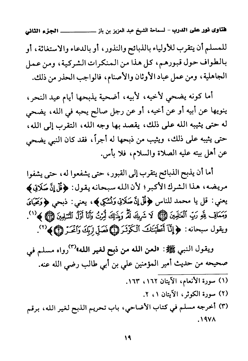 أما أن يذبح الذبائح يتقرب إلى القبور، حتى يشفعوا له، حتى يشفوا مريضه، هذا الشرك الأكبر؛ لأن الله سبحانه يقول: {قُلْ إِنَّ صَلَاتِي} (¬1) يعني: قل يا محمد للناس {قُلْ إِنَّ صَلَاتِي وَنُسُكِي} (¬2) يعني: ذبحي {وَمَحْيَايَ وَمَمَاتِي لِلَّهِ رَبِّ الْعَالَمِينَ} (¬3) {لَا شَرِيكَ لَهُ وَبِذَلِكَ أُمِرْتُ وَأَنَا أَوَّلُ الْمُسْلِمِينَ} (¬4) ويقوله سبحانه {إِنَّا أَعْطَيْنَاكَ الْكَوْثَرَ} (¬5) {فَصَلِّ لِرَبِّكَ وَانْحَرْ} (¬6).