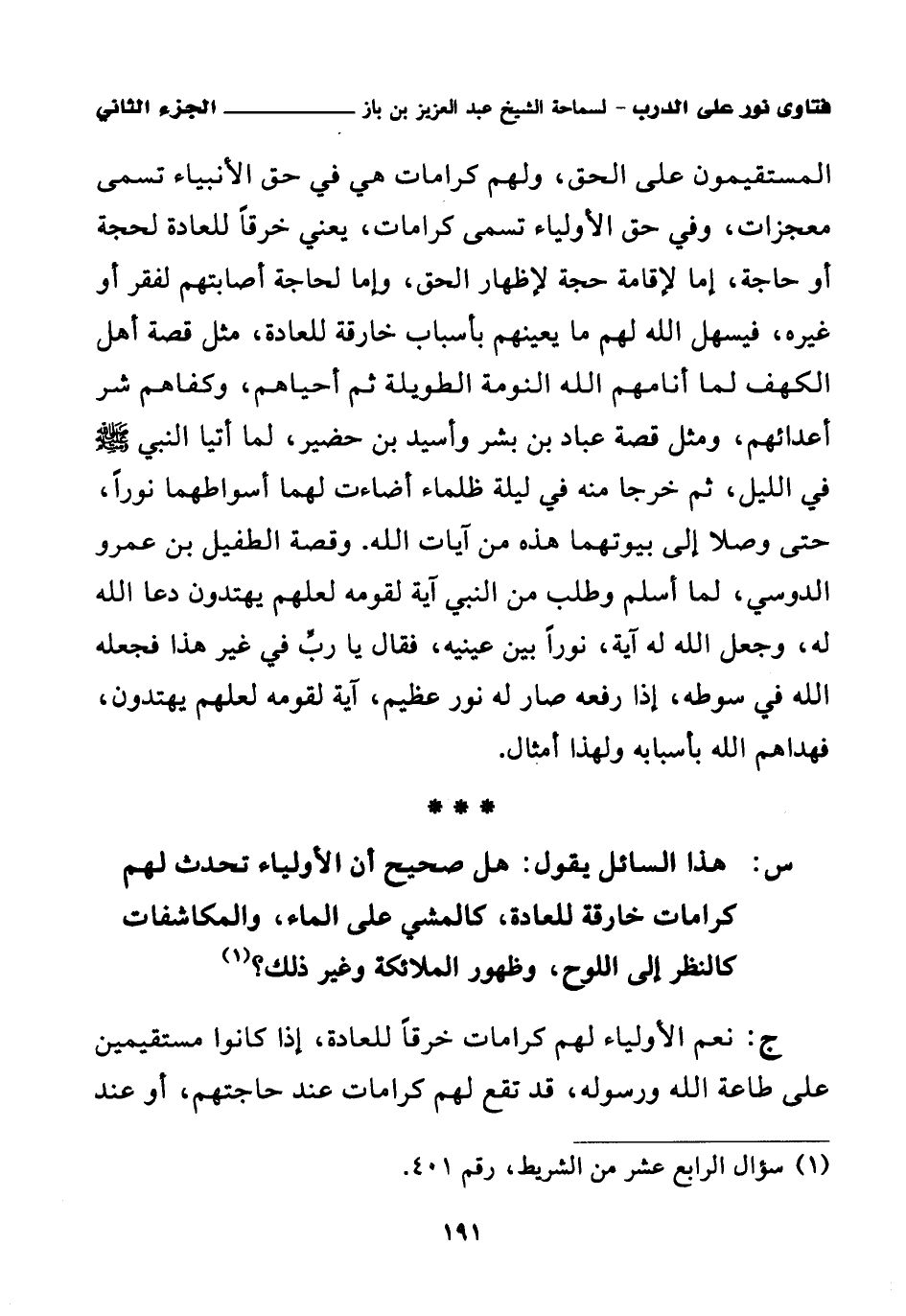 المستقيمون على الحق، ولهم كرامات هي في حق الأنبياء تسمى معجزات، وفي حق الأولياء تسمى كرامات، يعني خرقا للعادة لحجة أو حاجة، إما لإقامة حجة لإظهار الحق، وإما لحاجة أصابتهم لفقر أو غيره، فيسهل الله لهم ما يعينهم بأسباب خارقة للعادة، مثل قصة أهل الكهف لما أنامهم الله النومة الطويلة ثم أحياهم، وكفاهم شر أعدائهم، ومثل عباد بن بشر وأسيد بن حضير، لما أتيا النبي صلى الله عليه وسلم في الليل، ثم خرجا منه في ليلة ظلماء أضاءت لهما أسواطهما نورا، حتى وصلا إلى بيوتهما هذه من آيات الله. وقصة الطفيل بن عمرو الدوسي، لما أسلم وطلب من النبي آية لقومه لعلهم يهتدون دعا الله له، وجعل الله له آية، نورا بين عينيه، فقال يا رب في غير هذا فجعله الله في سوطه، إذا رفعه صار له نور عظيم، آية لقومه لعلهم يهتدون، فهداهم الله بأسبابه ولهذا أمثال.