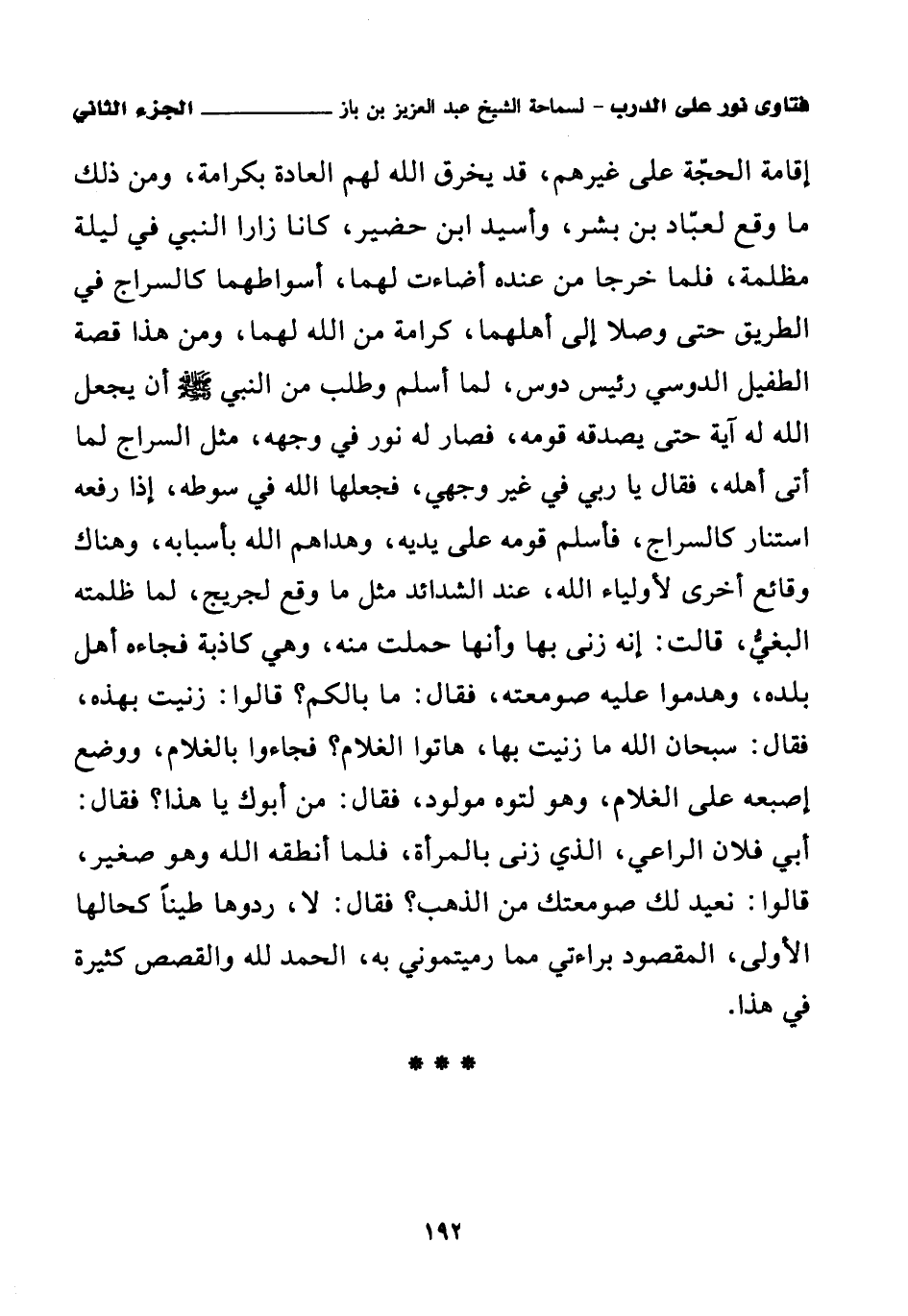 إقامة الحجة على غيرهم، قد يخرق الله لهم العادة بكرامة، ومن ذلك ما وقع لعباد بن بشر، وأسيد بن حضير، كانا زارا النبي في ليلة مظلمة، فلما خرجا من عنده أضاءت لهما أسواطهما كالسراج في الطريق حتى وصلا إلى أهلهما، كرامة من الله لهما، ومن هذا قصة الطفيل الدوسي رئيس دوس، لما أسلم وطلب من النبي صلى الله عليه وسلم أن يجعل الله له آية حتى يصدقه قومه، فصار له نور في وجهه مثل السراج لما أتى أهله، فقال يا ربي في غير وجهي فجعلها الله في سوطه، إذا رفعه استنار كالسراج، فأسلم قومه على يديه، وهداهم الله بأسبابه، وهناك وقائع أخرى لأولياء الله، عند الشدائد مثل ما وقع لجريج، لما ظلمته البغي، قالت: إنه زنى بها وأنها حملت منه، وهي كاذبة، فجاءه أهل بلده، وهدموا عليه صومعته، فقال: ما بالكم؟ قالوا: زنيت بهذه، فقال: سبحان الله ما زنيت بها، هاتوا الغلام؟ فجاءوا بالغلام، ووضع إصبعه على الغلام، وهو لتوه مولود، فقال: من أبوك يا هذا؟ فقال: أبي فلان الراعي، الذي زنى بالمرأة، فلما أنطقه الله وهو صغير، قالوا: نعيد لك صومعتك من الذهب؟ فقال: لا، ردوها طينا كحالها الأولى، المقصود براءتي مما رميتموني به، الحمد لله؛ والقصص كثيرة في هذا.