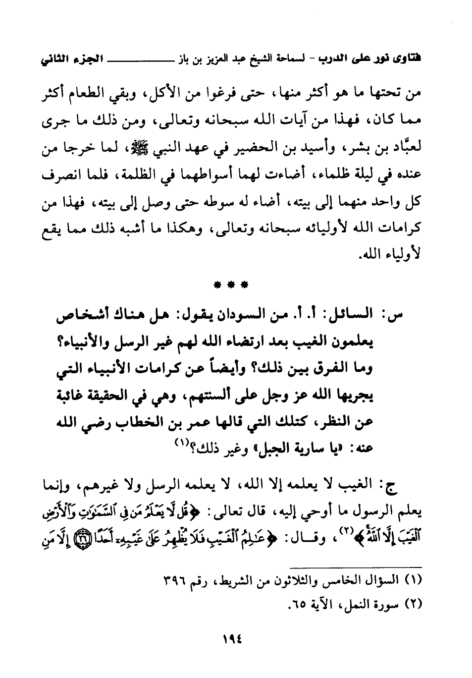 ج: الغيب لا يعلمه إلا الله، لا يعلمه الرسل ولا غيرهم، وإنما يعلم الرسول ما أوحي إليه، قال تعالى: {قُلْ لَا يَعْلَمُ مَنْ فِي السَّمَاوَاتِ وَالْأَرْضِ الْغَيْبَ إِلَّا اللَّهُ} (¬2)، وقال: عالم {الْغَيْبِ فَلَا يُظْهِرُ عَلَى غَيْبِهِ أَحَدًا} (¬3) {إِلَّا مَنِ ارْتَضَى مِنْ رَسُولٍ} (¬4)