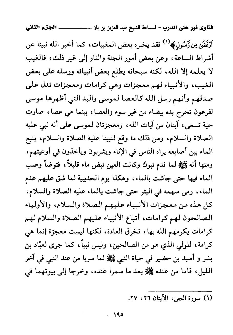 فقد يخبره بعض المغيبات، كما أخبر الله نبينا عن أشراط الساعة، وعن بعض أمور الجنة والنار إلى غير ذلك، فالغيب لا يعلمه إلا الله، لكنه سبحانه يطلع بعض أنبيائه ورسله على بعض الغيب، والأنبياء لهم معجزات وهي كرامات ومعجزات تدل على صدقهم وأنهم رسل الله كالعصا لموسى واليد التي أظهرها موسى لفرعون تخرج يده بيضاء من غير سوء والعصا، بينما هي عصا صارت حية تسعى، آيتان من آيات الله، ومعجزتان لموسى على أنه نبي عليه الصلاة والسلام، ومن ذلك ما وقع لنبينا عليه الصلاة والسلام، ينبع الماء بين أصابعه يراه الناس في الإناء ويشربون ويأخذون في أوعيتهم، ومنها أنه صلى الله عليه وسلم لما قدم تبوك وكانت العين تبض ماء قليلا، فتوضأ وصب الماء، رمى سهمه في البئر حتى جاشت بالماء عليه الصلاة والسلام.