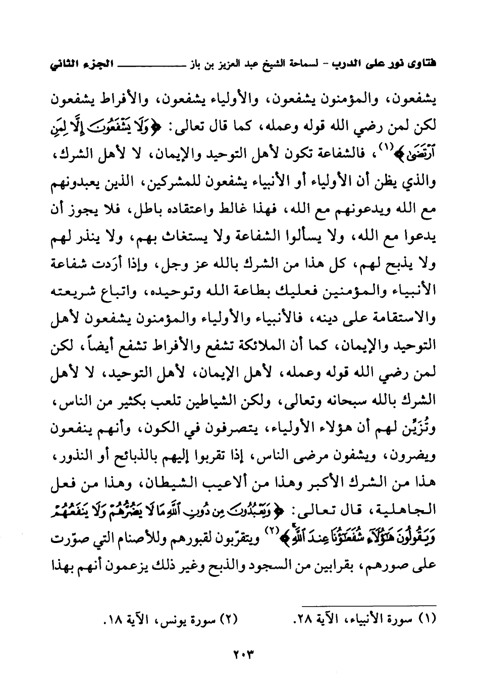 فالأنبياء والأولياء والمؤمنون يشفعون لأهل التوحيد والإيمان، كما أن الملائكة تشفع والأفراط تشفع أيضا، لكن لمن رضي الله قوله وعمله، لأهل الإيمان، لأهل التوحيد، لا لأهل الشرك بالله سبحانه وتعالى، ولكن الشياطين تلعب بكثير من الناس، وتزين لهم أن هؤلاء الأولياء يتصرفون في الكون وأنهم ينفعون ويضرون، ويشفون مرضى الناس، إذا تقربوا إليهم بالذبائح أو النذور، هذا من الشرك الأكبر وهذا من ألاعيب الشيطان، وهذا من فعل الجاهلية، قال تعالى: {وَيَعْبُدُونَ مِنْ دُونِ اللَّهِ مَا لَا يَضُرُّهُمْ وَلَا يَنْفَعُهُمْ وَيَقُولُونَ هَؤُلَاءِ شُفَعَاؤُنَا عِنْدَ اللَّهِ} (¬2) ويتقربون لقبورهم وللأصنام التي صورت على صورهم، بقرابين من السجود والذبح وغير ذلك يزعمون أنهم بهذا