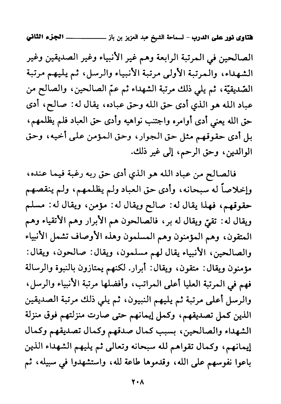 فالصالح من عباد الله هو الذي أدى حق ربه رغبة فيما عنده، وإخلاصا له سبحانه، وأدى حق العباد ولم يظلمهم، ولم ينقصهم حقوقهم، فهذا يقال له: صالح ويقال له: مؤمن، ويقال له: مسلم ويقال له: تقي؛ ويقال: له بر، فالصالحون هم الأبرار وهم الأتقياء وهم المتقون، وهم المؤمنون وهم المسلمون وهذه الأوصاف تشمل الأنبياء والصالحين، الأنبياء يقال لهم مسلمون، ويقال: صالحون، ويقال: مؤمنون ويقال: متقون، ويقال: أبرار. لكنهم يمتازون بالنبوة والرسالة فهم في المرتبة العليا أعلى المراتب، وأفضلها مرتبة الأنبياء والرسل، والرسل أعلى مرتبة ثم يليهم النبيون، ثم يلي ذلك مرتبة الصديقين الذين كمل تصديقهم، وكمل إيمانهم حتى صارت منزلتهم فوق منزلة الشهداء والصالحين، بسبب كمال صدقهم وكمال تصديقهم وكمال إيمانهم، وكمال تقواهم لله سبحانه وتعالى، ثم يليهم الشهداء الذين باعوا نفوسهم على الله، وقدموها طاعة لله، واستشهدوا في سبيله، ثم