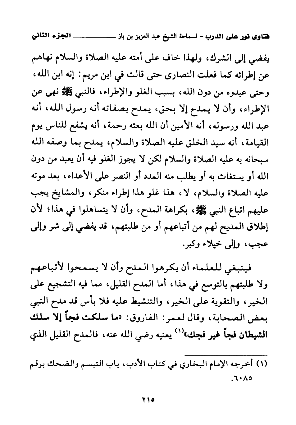 يفضي إلى الشرك، ولهذا خاف على أمته عليه الصلاة والسلام نهاهم عن إطرائه كما فعلت النصارى حتى قالت في ابن مريم: إنه ابن الله، وحتى عبدوه من دون الله، بسبب الغلو والإطراء، فالنبي صلى الله عليه وسلم نهى عن الإطراء، وأن لا يمدح إلا بحق، يمدح بصفاته أنه رسول الله، أنه عبد الله ورسوله، أنه الأمين أن الله بعثه رحمة، أنه يشفع للناس يوم القيامة، أنه سيد الخلق عليه الصلاة والسلام، يمدح بما وصفه الله سبحانه به عليه الصلاة والسلام، لكن لا يجوز الغلو فيه أن يعبد من دون الله أو يستغاث به أو يطلب منه المدد أو النصر على الأعداء بعد موته عليه الصلاة والسلام، لا، هذا غلو هذا إطراء منكر، والمشايخ يجب عليهم اتباع النبي صلى الله عليه وسلم، بكراهة المدح، وأن لا يتساهلوا في هذا؛ لأن إطلاق المديح لهم من أتباعهم أو من طلبتهم، قد يفضي إلى شر وإلى عجب، وإلى خيلاء وكبر.