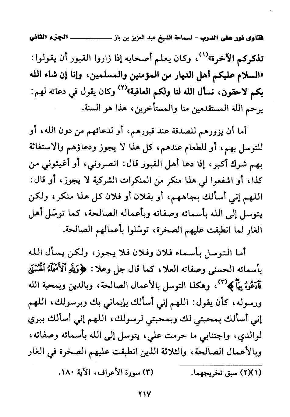 أما أن يزورهم للصدقة عند قبورهم، أو لدعائهم من دون الله، أو للتوسل بهم، أو للطعام عندهم، كل هذا لا يجوز، ودعاؤهم والاستغاثة بهم شرك أكبر، إذا دعا أهل القبور قال: انصروني، أو أغيثوني من كذا، أو اشفعوا لي هذا منكر من المنكرات الشركية لا يجوز، أو قال: اللهم إني أسألك بجاههم، أو بفلان أو فلان، كل هذا منكر، ولكن يتوسل إلى الله بأسمائه وصفاته وبأعماله الصالحة، كما توسل أهل الغار لما انطبقت عليهم الصخرة، توسلوا بأعمالهم الصالحة.