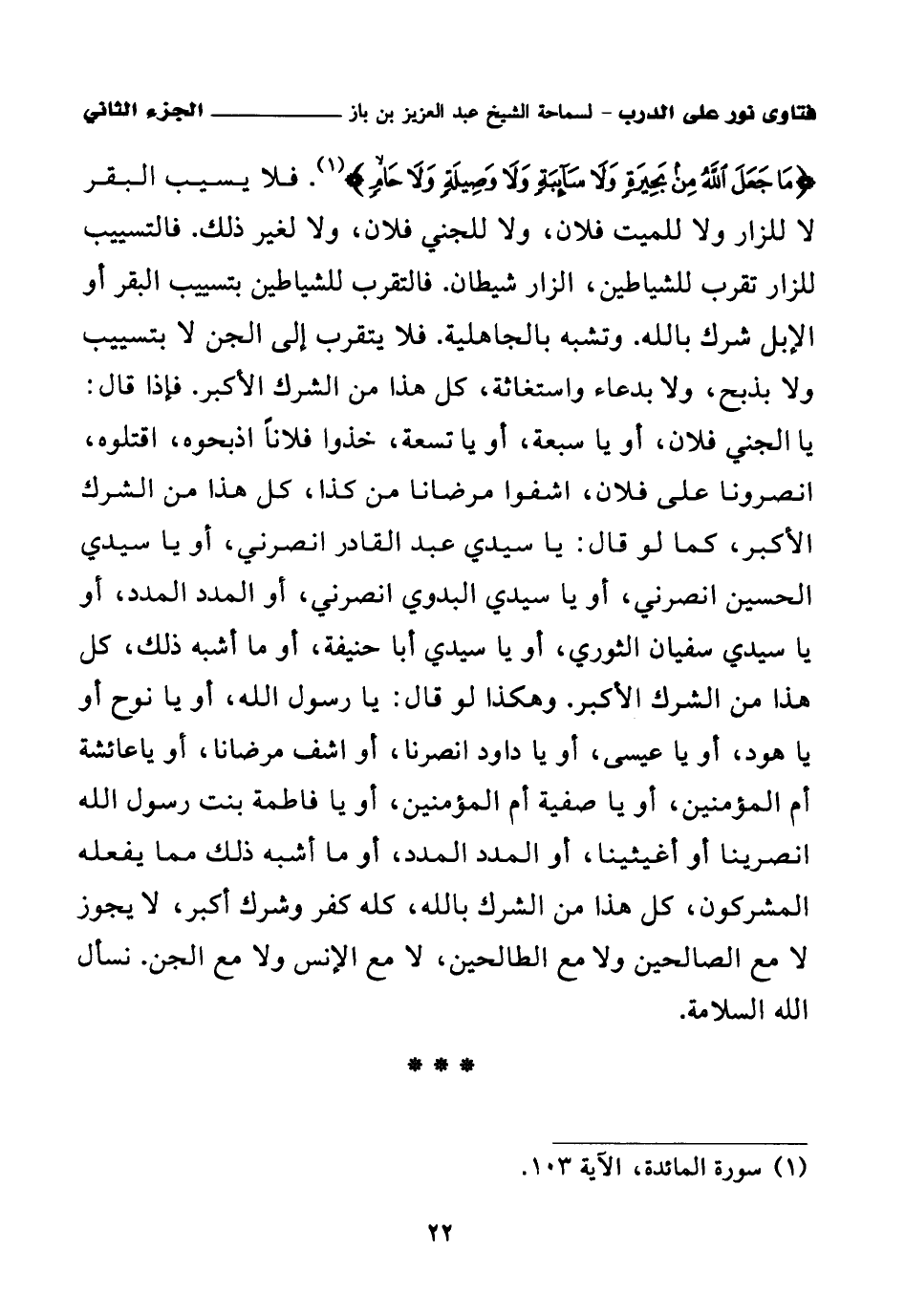 {مَا جَعَلَ اللَّهُ مِنْ بَحِيرَةٍ وَلَا سَائِبَةٍ وَلَا وَصِيلَةٍ وَلَا حَامٍ} (¬1) فلا يسيب البقر لا للزار ولا للميت فلان، ولا للجني فلان، ولا لغير ذلك. فالتسييب للزار تقرب للشياطين، الزار شيطان. فالتقرب للشياطين بتسييب البقر أو الإبل شرك بالله وتشبه بالجاهلية. فلا يتقرب إلى الجن لا بتسييب ولا بذبح، ولا بدعاء واستغاثة، كل هذا من الشرك الأكبر؛ فإذا قال: يا الجني فلان، أو يا سبعة، أو يا تسعة، خذوا فلانا اذبحوه، اقتلوه، انصرونا على فلان، اشفوا مرضانا من كذا، كل هذا من الشرك الأكبر، كما لو قال: يا سيدي عبد القادر انصرني، أو يا سيدي الحسين انصرني، أو يا سيدي البدوي انصرني، أو المدد المدد، أو يا سيدي سفيان الثوري، أو يا سيدي أبا حنيفة، أو ما أشبه ذلك، كل هذا من الشرك الأكبر. وهكذا لو قال: يا رسول الله، أو يا نوح أو يا هود، أو يا عيسى، أو يا داود انصرنا، أو اشف مرضانا، أو يا عائشة أم المؤمنين، أو يا صفية أم المؤمنين، أو يا فاطمة بنت رسول الله انصرينا أو أغيثينا، أو المدد المدد، أو ما أشبه ذلك مما يفعله المشركون، كل هذا من الشرك بالله، كله كفر وشرك أكبر، لا يجوز لا مع الصالحين ولا مع الطالحين، لا مع الإنس ولا مع الجن. نسأل الله السلامة.