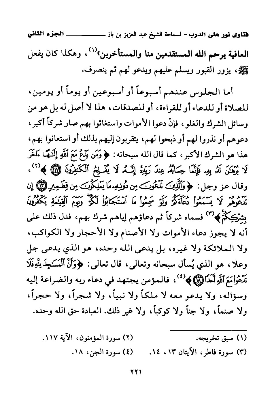 أما الجلوس عندهم أسبوعا أو أسبوعين أو يوما أو يومين، للصلاة أو للدعاء أو للقراءة، أو للصدقات، هذا لا أصل له، بل هو من وسائل الشرك والغلو، فإن دعوا الأموات واستغاثوا بهم صار شركا أكبر، دعوهم أو نذروا لهم أو ذبحوا لهم، يتقربون إليهم بذلك أو استعانوا بهم هذا هو الشرك الأكبر، كما قال الله سبحانه: {وَمَنْ يَدْعُ مَعَ اللَّهِ إِلَهًا آخَرَ لَا بُرْهَانَ لَهُ بِهِ فَإِنَّمَا حِسَابُهُ عِنْدَ رَبِّهِ إِنَّهُ لَا يُفْلِحُ الْكَافِرُونَ} (¬2)، وقال عز وجل: {وَالَّذِينَ تَدْعُونَ مِنْ دُونِهِ مَا يَمْلِكُونَ مِنْ قِطْمِيرٍ} (¬3) {إِنْ تَدْعُوهُمْ لَا يَسْمَعُوا دُعَاءَكُمْ وَلَوْ سَمِعُوا مَا اسْتَجَابُوا لَكُمْ وَيَوْمَ الْقِيَامَةِ يَكْفُرُونَ بِشِرْكِكُمْ} (¬4) فسماه شركا ثم دعاؤهم إياهم شرك بهم، فدل ذلك على أنه لا يجوز دعاء الأموات ولا الأصنام ولا الأحجار ولا الكواكب، ولا الملائكة ولا غيره، بل يدعى الله وحده، هو الذي يدعى جل وعلا، هو الذي يسأل سبحانه وتعالى، قال تعالى: {وَأَنَّ الْمَسَاجِدَ لِلَّهِ فَلَا تَدْعُوا مَعَ اللَّهِ أَحَدًا} (¬5)، فالمؤمن يجتهد في دعاء ربه والضراعة إليه وسؤاله، ولا يدعو معه لا ملكا ولا نبيا، ولا شجرا، ولا حجرا، ولا صنما، ولا جنا ولا كوكبا، ولا غير ذلك. العبادة حق الله وحده.