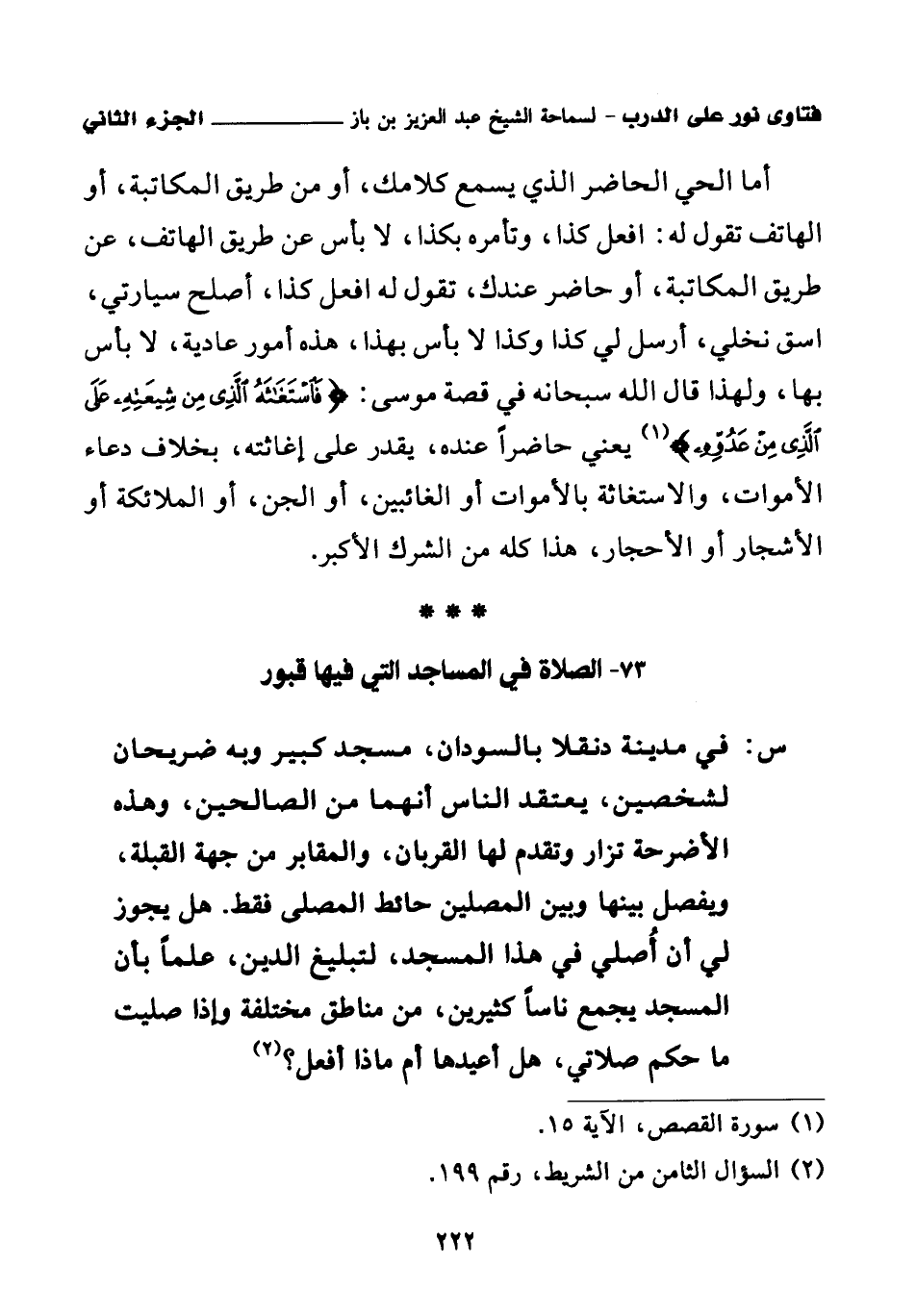 أما الحي الحاضر الذي يسمع كلامك، أو من طريق المكاتبة، أو الهاتف تقول له: افعل كذا، وتأمره بكذا، لا بأس عن طريق الهاتف، عن طريق المكاتبة، أو حاضر عندك، تقول له افعل كذا، أصلح سيارتي، اسق نخلي، أرسل لي كذا وكذا لا بأس بهذا، هذه أمور عادية لا بأس بها، ولهذا قال الله سبحانه في قصة موسى: {فَاسْتَغَاثَهُ الَّذِي مِنْ شِيعَتِهِ عَلَى الَّذِي مِنْ عَدُوِّهِ} (¬1) يعني حاضرا عنده، يقدر على إغاثته، بخلاف دعاء الأموات، والاستغاثة بالأموات أو الغائبين، أو الجن، أو الملائكة أو الأشجار أو الأحجار، هذا كله من الشرك الأكبر.