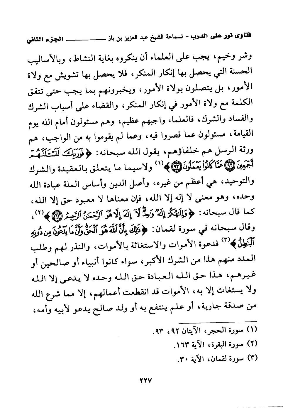 وشر وخيم، يجب على العلماء أن ينكروه بغاية النشاط، وبالأساليب الحسنة التي يحصل بها إنكار المنكر، فلا يحصل بها تشويش مع ولاة الأمور، بل يتصلون بولاة الأمور، ويخبرونهم بما يجب حتى تتفق الكلمة مع ولاة الأمور في إنكار المنكر، والقضاء على أسباب الشرك والفساد والشرك، فالعلماء واجبهم عظيم، وهم مسئولون أمام الله يوم القيامة، مسئولون عما قصروا فيه، وعما لم يقوموا به من الواجب، هم ورثة الرسل، هم خلفاؤهم، يقول الله سبحانه: {فَوَرَبِّكَ لَنَسْأَلَنَّهُمْ أَجْمَعِينَ} (¬1) {عَمَّا كَانُوا يَعْمَلُونَ} (¬2) ولا سيما ما يتعلق بالعقيدة والشرك والتوحيد، هي أعظم من غيره.