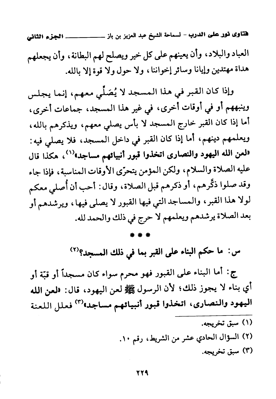 ج: أما البناء على القبور فهو محرم سواء كان مسجدا أو قبة أو أي بناء لا يجوز ذلك؛ لأن الرسول صلى الله عليه وسلم لعن اليهود، قال: «لعن الله اليهود والنصارى، اتخذوا قبور أنبيائهم مساجد (¬3)» فعلل اللعنة