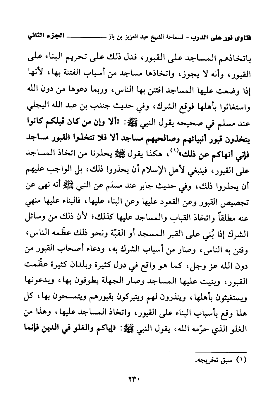 باتخاذهم المساجد على القبور، فدل ذلك على تحريم البناء على القبور، وأنه لا يجوز، واتخاذها مساجد من أسباب الفتنة بها، لأنها إذا وضعت عليها المساجد افتتن بها الناس، وربما دعوها من دون الله واستغاثوا بأهلها فوقع الشرك، وفي حديث جندب بن عبد الله البجلي عند مسلم في صحيحه يقول النبي صلى الله عليه وسلم: «ألا وإن من كان قبلكم كانوا يتخذون قبور أنبيائهم وصالحيهم مساجد، ألا فلا تتخذوا القبور مساجد فإني أنهاكم عن ذلك (¬1)»، هكذا يقول صلى الله عليه وسلم يحذرنا من اتخاذ المساجد على القبور، فينبغي لأهل الإسلام أن يحذروا ذلك، بل الواجب عليهم أن يحذروا ذلك، وفي حديث جابر عند مسلم عن النبي صلى الله عليه وسلم أنه نهى عن تجصيص القبور وعن القعود عليها أو البناء عليها، فالبناء عليها منهي عنه مطلقا واتخاذ القباب والمساجد عليها كذلك؛ لأن ذلك من وسائل الشرك إذا بني على القبر المسجد أو القبة ونحو ذلك عظمه الناس، وفتن به الناس، وصار من أسباب الشرك به، ودعاء أصحاب القبور من دون الله عز وجل، كما هو واقع في دول كثيرة وبلدان كثيرة عظمت القبور، وبنيت عليها المساجد وصار الجهلة يطوفون بها، ويدعونها ويستغيثون بأهلها، وينذرون لهم ويتبركون بقبورهم ويتمسحون بها، كل هذا وقع بأسباب البناء على القبور، واتخاذ المساجد عليها، وهذا من باب الغلو الذي حرمه الله، يقول النبي صلى الله عليه وسلم: «إياكم والغلو في الدين فإنما