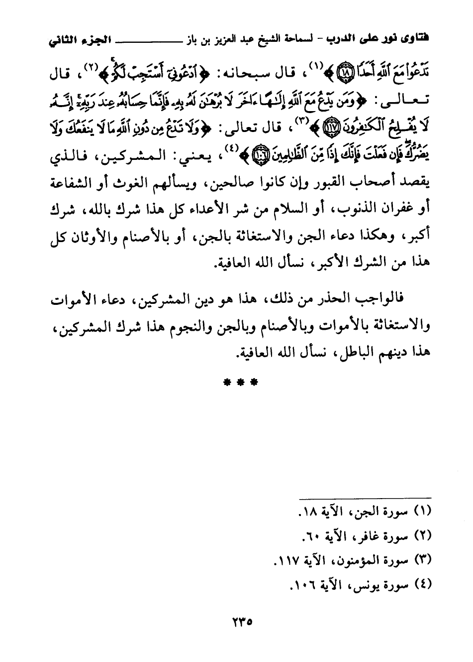 قال سبحانه: {ادْعُونِي أَسْتَجِبْ لَكُمْ} (¬1)، قال تعالى: {وَمَنْ يَدْعُ مَعَ اللَّهِ إِلَهًا آخَرَ لَا بُرْهَانَ لَهُ بِهِ فَإِنَّمَا حِسَابُهُ عِنْدَ رَبِّهِ إِنَّهُ لَا يُفْلِحُ الْكَافِرُونَ} (¬2)، قال تعالى: {وَلَا تَدْعُ مِنْ دُونِ اللَّهِ مَا لَا يَنْفَعُكَ وَلَا يَضُرُّكَ فَإِنْ فَعَلْتَ فَإِنَّكَ إِذًا مِنَ الظَّالِمِينَ} (¬3)، يعني: المشركين، فالذي يقصد أصحاب القبور وإن كانوا صالحين، ويسألهم الغوث أو الشفاعة أو غفران الذنوب، أو السلام من شر الأعداء كل هذا شرك بالله، شرك أكبر، وهكذا دعاء الجن والاستغاثة بالجن، أو بالأصنام والأوثان كل هذا من الشرك الأكبر، نسأل الله العافية.