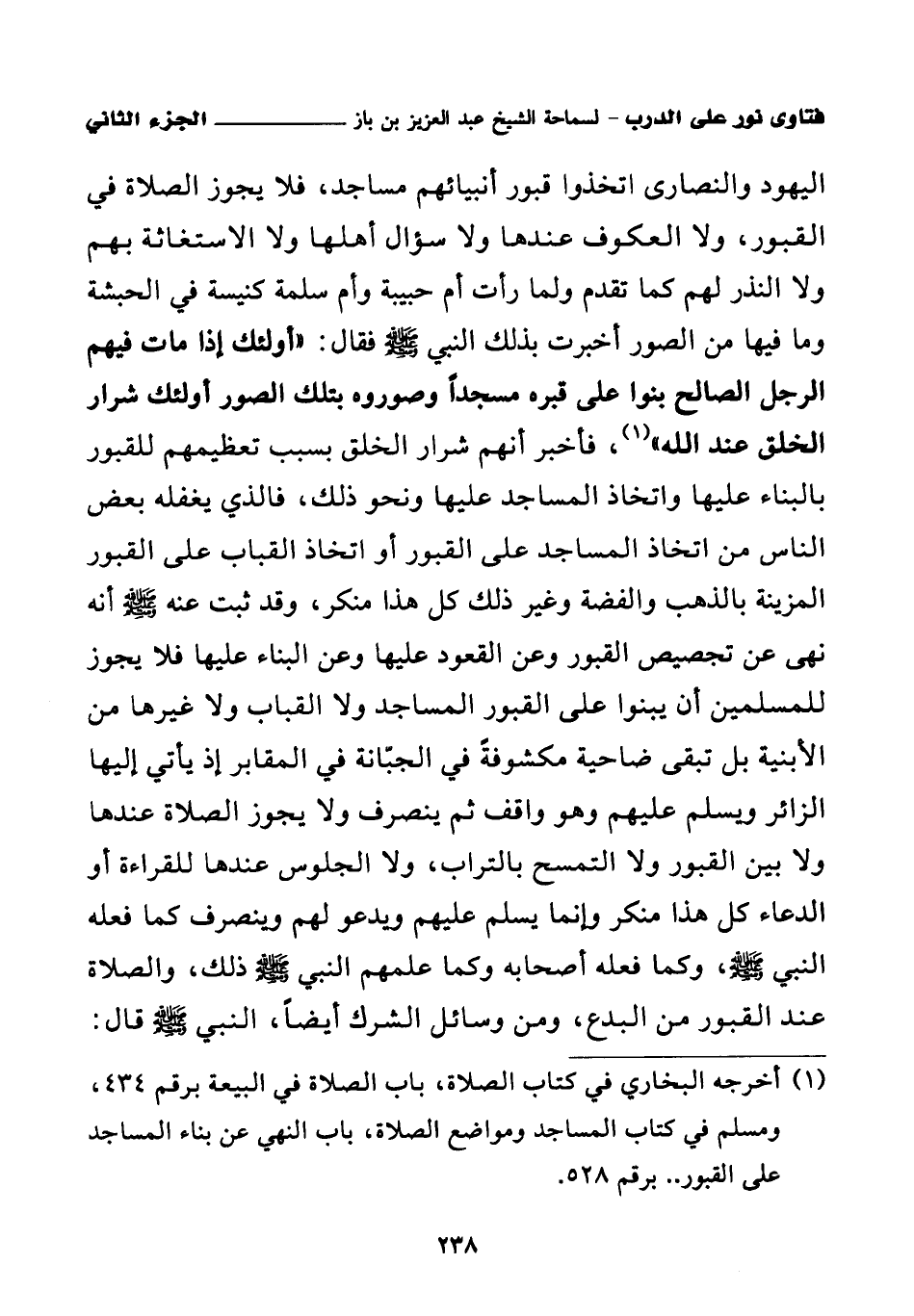 اليهود والنصارى اتخذوا قبور أنبيائهم مساجد، فلا يجوز الصلاة في القبور، ولا العكوف عندها ولا سؤال أهلها ولا الاستغاثة بهم ولا النذر لهم كما تقدم، ولما رأت أم حبيبة وأم سلمة كنيسة في الحبشة وما فيها من الصور أخبرت بذلك النبي صلى الله عليه وسلم فقال: «أولئك إذا مات فيهم الرجل الصالح بنوا على قبره مسجدا وصوروه بتلك الصور، أولئك شرار الخلق عند الله (¬1)»، فأخبر أنهم شرار الخلق بسبب تعظيمهم للقبور بالبناء عليها واتخاذ المساجد عليها ونحو ذلك، فالذي يغفله بعض الناس من اتخاذ المساجد على القبور أو اتخاذ القباب على القبور المزينة بالذهب والفضة وغير ذلك كل هذا منكر.