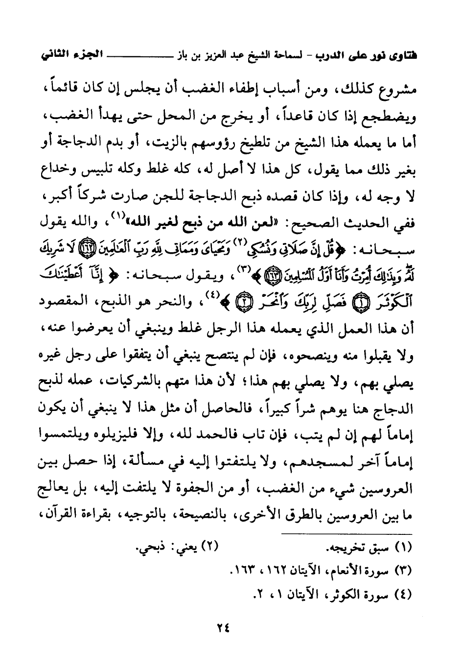 مشروع كذلك، ومن أسباب إطفاء الغضب أن يجلس إن كان قائما، ويضطجع إذا كان قاعدا، أو يخرج من المحل حتى يهدأ الغضب، أما ما يعمله هذا الشيخ من تلطيخ رؤوسهم بالزيت، أو بدم الدجاجة أو بغير ذلك مما يقول، كل هذا لا أصل له، كله غلط وكله تلبيس وخداع لا وجه له، وإذا كان قصده ذبح الدجاجة للجن صارت شركا أكبر، ففي الحديث الصحيح: «لعن الله من ذبح لغير الله (¬1)»، والله يقول سبحانه: {قُلْ إِنَّ صَلَاتِي وَنُسُكِي} (¬2) (¬3) {وَمَحْيَايَ وَمَمَاتِي لِلَّهِ رَبِّ الْعَالَمِينَ} (¬4) {لَا شَرِيكَ لَهُ وَبِذَلِكَ أُمِرْتُ وَأَنَا أَوَّلُ الْمُسْلِمِينَ} (¬5)، ويقول سبحانه: {إِنَّا أَعْطَيْنَاكَ الْكَوْثَرَ} (¬6) {فَصَلِّ لِرَبِّكَ وَانْحَرْ} (¬7)، والنحر هو الذبح؛ المقصود أن هذا العمل الذي يعمله هذا الرجل غلط وينبغي أن يعرضوا عنه، ولا يقبلوا منه وينصحوه، فإن لم ينتصح ينبغي أن يتفقوا على رجل غيره يصلي بهم، ولا يصلي بهم هذا؛ لأن هذا متهم بالشركيات، عمله لذبح الدجاج هنا يوهم شرا كبيرا، فالحاصل أن مثل هذا لا ينبغي أن يكون إماما لهم إن لم يتب، فإن تاب فالحمد لله، وإلا فليزيلوه ويلتمسوا إماما آخر لمسجدهم، ولا يلتفتوا إليه في مسألة، إذا حصل بين العروسين شيء من الغضب، أو من الجفوة لا يلتفت إليه، بل يعالج ما بين العروسين بالطرق الأخرى، بالنصيحة، بالتوجيه، بقراءة القرآن،