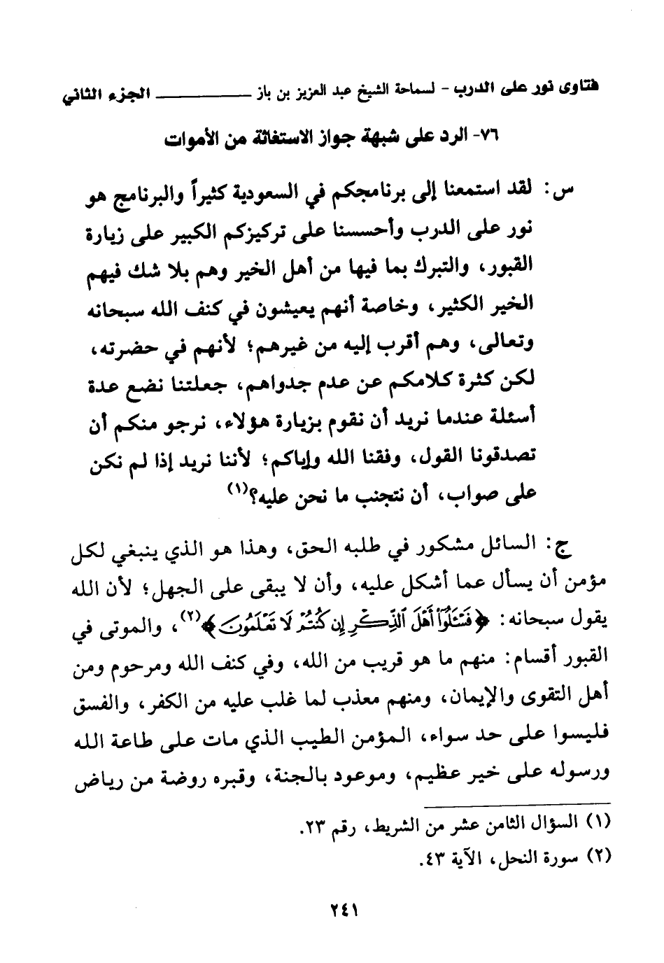 ج: السائل مشكور في طلبه الحق، وهذا هو الذي ينبغي لكل مؤمن أن يسأل عما أشكل عليه، وأن لا يبقى على الجهل؛ لأن الله يقول سبحانه: {فَاسْأَلُوا أَهْلَ الذِّكْرِ إِنْ كُنْتُمْ لَا تَعْلَمُونَ} (¬2)، والموتى في القبور أقسام: منهم ما هو قريب من الله، وفي كنف الله ومرحوم ومن أهل التقوى والإيمان، ومنهم معذب لما غلب عليه من الكفر، والفسق فليسوا على حد سواء، المؤمن الطيب الذي مات على طاعة الله ورسوله على خير عظيم، وموعود بالجنة، وقبره روضة من رياض