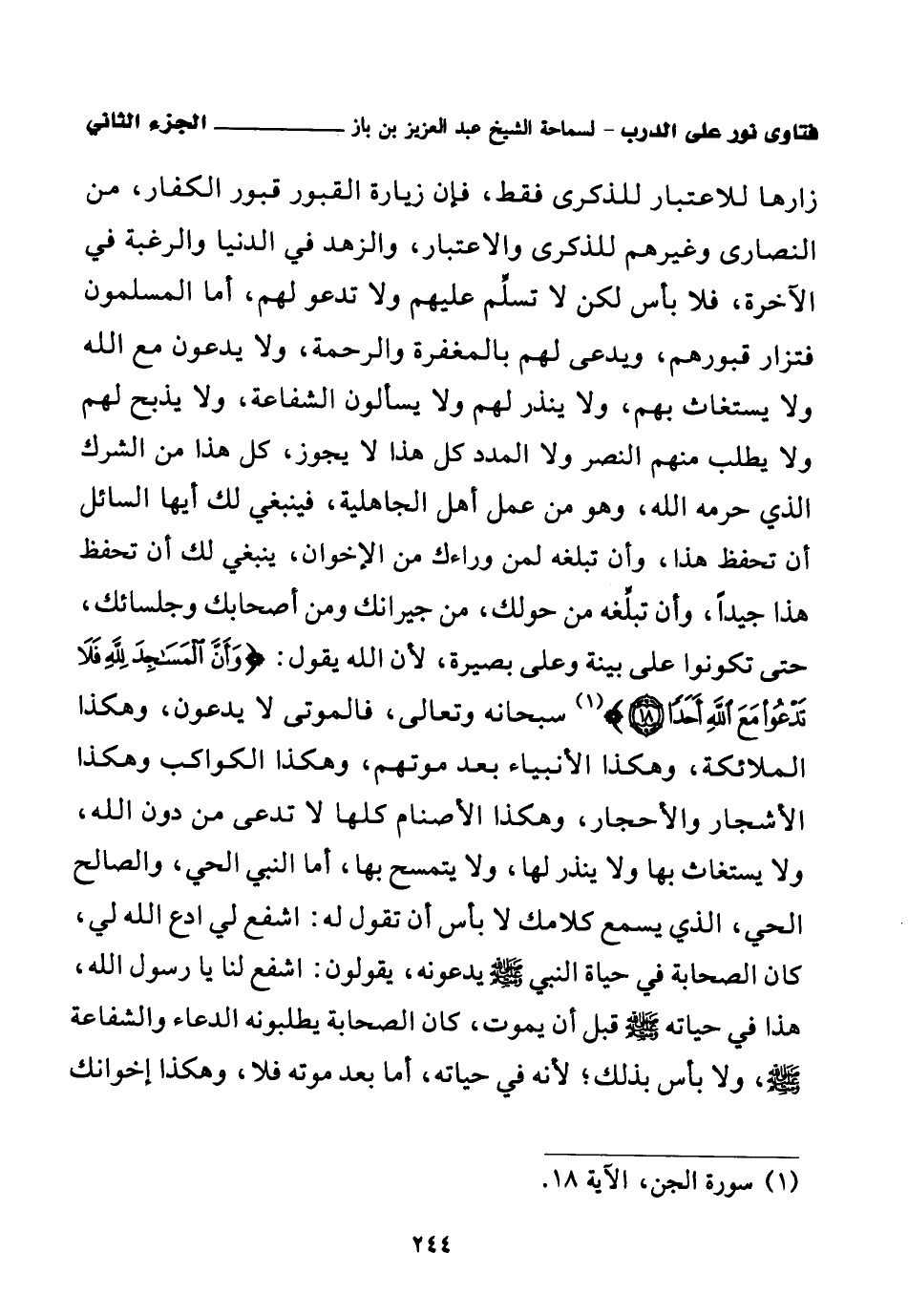 فينبغي لك أيها السائل أن تحفظ هذا، وأن تبلغه لمن وراءك من الإخوان، ينبغي لك أن تحفظ هذا جيدا، وأن تبلغه من حولك، من جيرانك ومن أصحابك وجلسائك، حتى تكونوا على بينة وعلى بصيرة، لأن الله يقول: {وَأَنَّ الْمَسَاجِدَ لِلَّهِ فَلَا تَدْعُوا مَعَ اللَّهِ أَحَدًا} (¬1) سبحانه وتعالى، فالموتى لا يدعون، وهكذا الملائكة، وهكذا الأنبياء بعد موتهم، وهكذا الكواكب وهكذا الأشجار والأحجار، وهكذا الأصنام كلها لا تدعى من دون الله، ولا يستغاث بها ولا ينذر لها، ولا يتمسح بها، أما النبي الحي، والصالح الحي، الذي يسمع كلامك لا بأس أن تقول له: اشفع لي ادع الله لي، كان الصحابة في حياة النبي صلى الله عليه وسلم يدعونه، يقولون: اشفع لنا يا رسول الله، هذا في حياته صلى الله عليه وسلم قبل أن يموت، كان الصحابة يطلبونه الدعاء والشفاعة صلى الله عليه وسلم، ولا بأس بذلك؛ لأنه في حياته، أما بعد موته فلا، وهكذا إخوانك