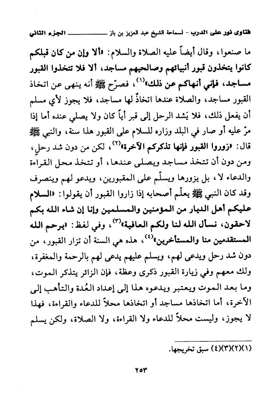ما صنعوا، وقال أيضا عليه الصلاة والسلام: «ألا وإن من كان قبلكم كانوا يتخذون قبور أنبيائهم وصالحيهم مساجد، ألا فلا تتخذوا القبور مساجد، فإني أنهاكم عن ذلك (¬1)»، فصرح صلى الله عليه وسلم أنه ينهى عن اتخاذ القبور مساجد، والصلاة عندها اتخاذ لها مساجد، فلا يجوز لأي مسلم أن يفعل ذلك، فلا يشد الرحل إلى قبر أيا كان ولا يصلي عنده، أما إذا مر عليه أو صار في البلد وزاره للسلام على القبور هذا سنة، والنبي صلى الله عليه وسلم قال: «زوروا القبور فإنها تذكركم الآخرة (¬2)»، لكن من دون شد رحل، ومن دون أن تتخذ مساجد ويصلى عندها، أو تتخذ محل القراءة والدعاء، لا، بل يزورها ويسلم على المقبورين، ويدعو لهم وينصرف.
