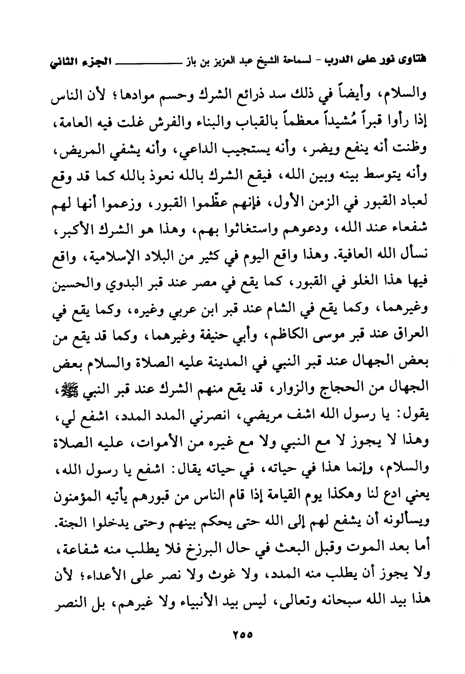 وهذا واقع اليوم في كثير من البلاد الإسلامية، واقع فيها هذا الغلو في القبور، كما يقع في مصر عند قبر البدوي والحسين وغيرهما، وكما يقع في الشام عند قبر ابن عربي وغيره، وكما يقع في العراق عند قبر موسى الكاظم، وأبي حنيفة وغيرهما، وكما قد يقع من بعض الجهال عند قبر النبي في المدينة عليه الصلاة والسلام، بعض الجهال من الحجاج والزوار، قد يقع منهم الشرك عند قبر النبي صلى الله عليه وسلم، يقول: يا رسول الله اشف مريضي، انصرني، المدد المدد، اشفع لي، وهذا لا يجوز لا مع النبي ولا مع غيره من الأموات، عليه الصلاة والسلام، وإنما هذا في حياته، في حياته يقال: اشفع يا رسول الله، يعني ادع لنا، وهكذا، يوم القيامة إذا قام الناس من قبورهم يأتيه المؤمنون ويسألونه أن يشفع لهم إلى الله حتى يحكم بينهم وحتى يدخلوا الجنة. أما بعد الموت وقبل البعث في حال البرزخ فلا يطلب منه شفاعة، ولا يجوز أن يطلب منه المدد، ولا غوث ولا نصر على الأعداء؛ لأن هذا بيد الله سبحانه وتعالى، ليس بيد الأنبياء ولا غيرهم، بل النصر