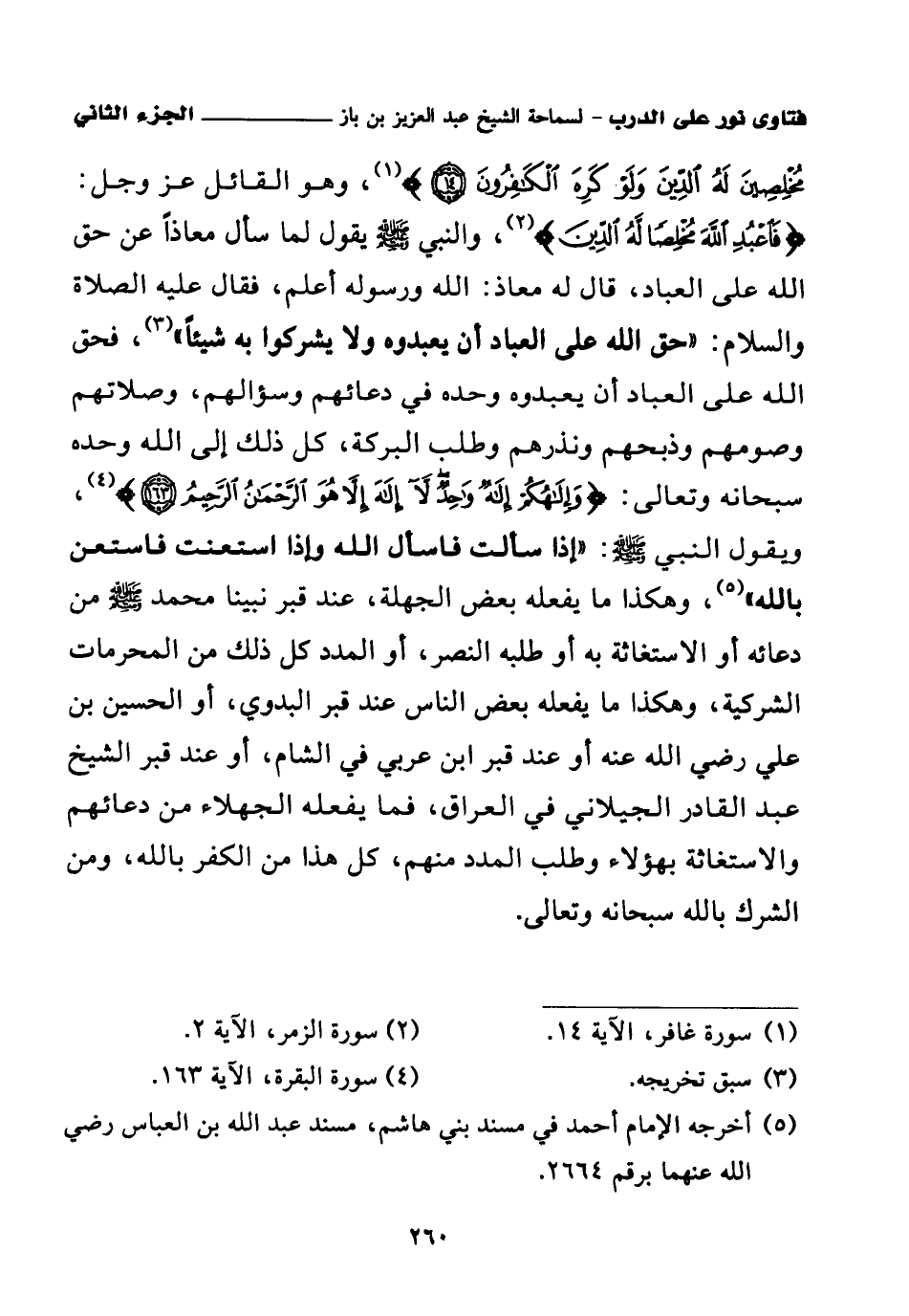 {فَادْعُوا اللَّهَ مُخْلِصِينَ لَهُ الدِّينَ وَلَوْ كَرِهَ الْكَافِرُونَ} (¬1)، وهو القائل عز وجل: {فَاعْبُدِ اللَّهَ مُخْلِصًا لَهُ الدِّينَ} (¬2)، والنبي صلى الله عليه وسلم يقول لما سأل معاذا عن حق الله على العباد، قال له معاذ: الله ورسوله أعلم، فقال عليه الصلاة والسلام: «حق الله على العباد أن يعبدوه ولا يشركوا به شيئا (¬3)»، فحق الله على العباد أن يعبدوه وحده في دعائهم وسؤالهم، وصلاتهم وصومهم وذبحهم ونذرهم وطلب البركة، كل ذلك إلى الله وحده سبحانه وتعالى: {وَإِلَهُكُمْ إِلَهٌ وَاحِدٌ لَا إِلَهَ إِلَّا هُوَ الرَّحْمَنُ الرَّحِيمُ} (¬4)، ويقول النبي صلى الله عليه وسلم: «إذا سألت فاسأل الله وإذا استعنت فاستعن بالله (¬5)»، وهكذا ما يفعله بعض الجهلة، عند قبر نبينا محمد صلى الله عليه وسلم من دعائه أو الاستغاثة به أو طلبه النصر أو المدد، كل ذلك من المحرمات الشركية وهكذا ما يفعله بعض الناس عند قبر البدوي، أو الحسين بن علي رضي الله عنه أو عند قبر ابن عربي في الشام، أو عند قبر الشيخ عبد القادر الجيلاني في العراق، فما يفعله الجهلاء من دعائهم والاستغاثة بهؤلاء وطلب المدد منهم، كل هذا من الكفر بالله، ومن الشرك بالله سبحانه وتعالى.
