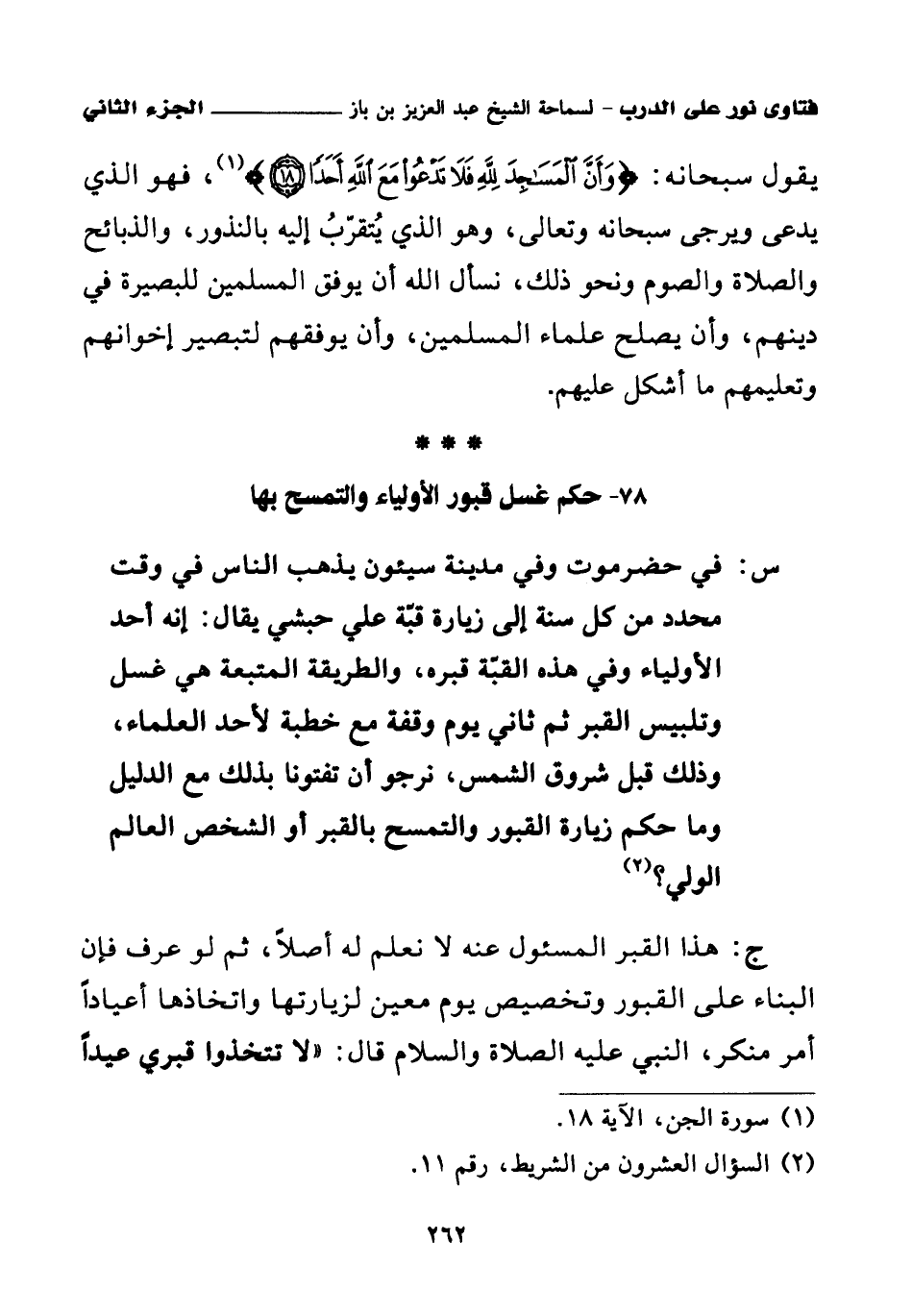 يقول سبحانه: {وَأَنَّ الْمَسَاجِدَ لِلَّهِ فَلَا تَدْعُوا مَعَ اللَّهِ أَحَدًا} (¬1)، فهو الذي يدعى ويرجى سبحانه وتعالى، وهو الذي يتقرب إليه بالنذور، والذبائح والصلاة والصوم ونحو ذلك، نسأل الله أن يوفق المسلمين للبصيرة في دينهم، وأن يصلح علماء المسلمين، وأن يوفقهم لتبصير إخوانهم وتعليمهم ما أشكل عليهم.