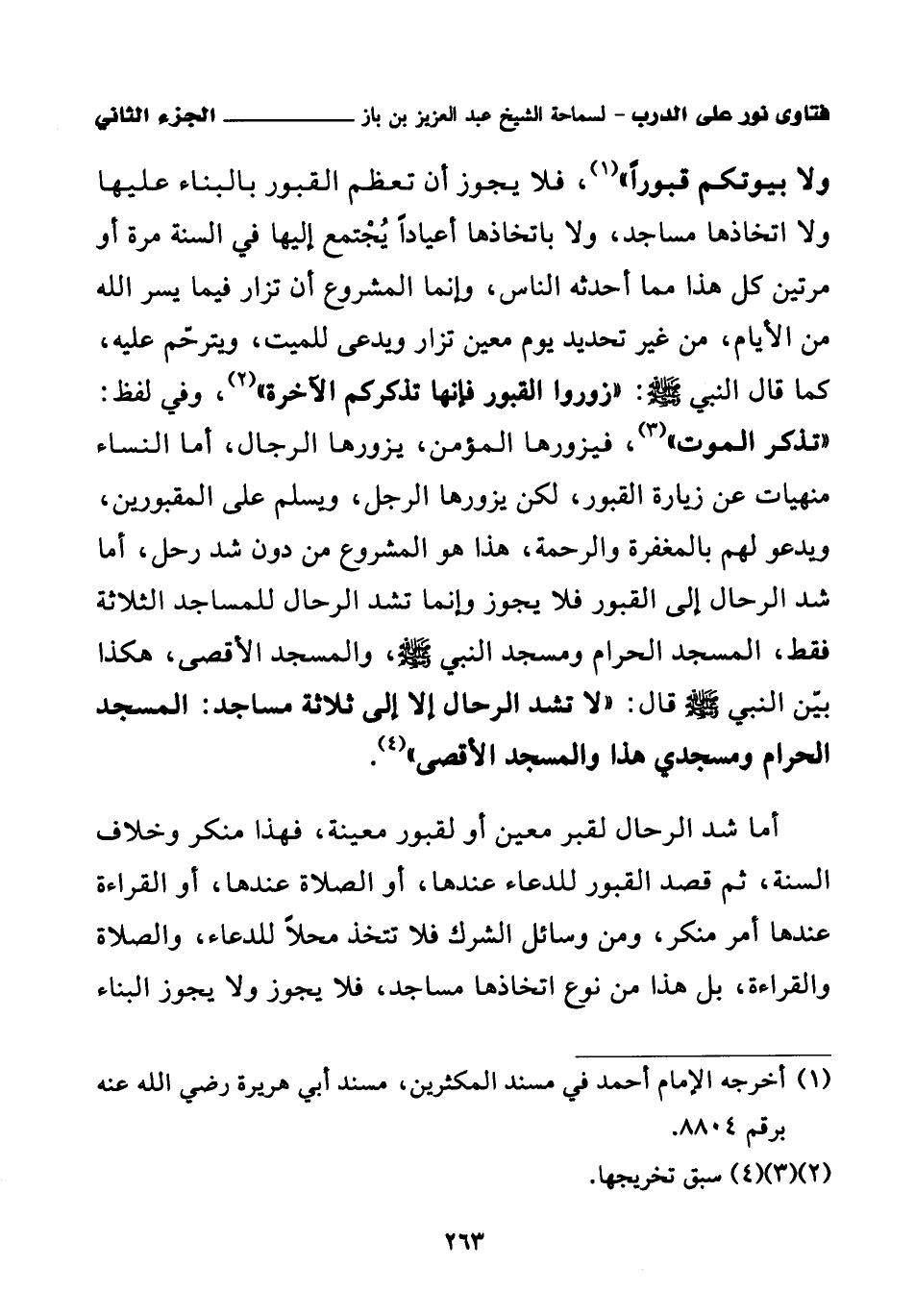 ولا بيوتكم قبورا (¬1)»، فلا يجوز أن تعظم القبور بالبناء عليها ولا اتخاذها مساجد، ولا باتخاذها أعيادا يجتمع إليها في السنة مرة أو مرتين، كل هذا مما أحدثه الناس، وإنما المشروع أن تزار فيما يسر الله من الأيام، من غير تحديد يوم معين تزار ويدعى للميت، ويترحم عليه، كما قال النبي صلى الله عليه وسلم: «زوروا القبور فإنها تذكركم الآخرة (¬2)»، وفي لفظ: «تذكر الموت (¬3)»، فيزورها المؤمن، يزورها الرجال، أما النساء منهيات عن زيارة القبور، لكن يزورها الرجل، ويسلم على المقبورين، ويدعو لهم بالمغفرة والرحمة، هذا هو المشروع من دون شد رحل، أما شد الرحال إلى القبور فلا يجوز، وإنما تشد الرحال للمساجد الثلاثة فقط، المسجد الحرام ومسجد النبي صلى الله عليه وسلم، والمسجد الأقصى، هكذا بين النبي صلى الله عليه وسلم قال: «لا تشد الرحال إلا إلى ثلاثة مساجد: المسجد الحرام ومسجدي هذا والمسجد الأقصى (¬4)».