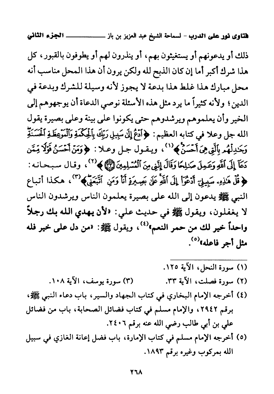 ذلك أو يدعونهم أو يستغيثون بهم، أو ينذرون لهم أو يطوفون بالقبور، كل هذا شرك أكبر؛ أما إن كان الذبح لله ولكن يرون أن هذا المحل مناسب أنه محل مبارك، هذا غلط، هذا بدعة لا يجوز لأنه وسيلة للشرك وبدعة في الدين؛ ولأنه كثيرا ما يرد مثل هذه الأسئلة؛ نوصي الدعاة أن يوجهوهم إلى الخير وأن يعلموهم ويرشدوهم حتى يكونوا على بينة وعلى بصيرة؛ يقول الله جل وعلا في كتابه العظيم: {ادْعُ إِلَى سَبِيلِ رَبِّكَ بِالْحِكْمَةِ وَالْمَوْعِظَةِ الْحَسَنَةِ وَجَادِلْهُمْ بِالَّتِي هِيَ أَحْسَنُ} (¬1)، ويقول جل وعلا: {وَمَنْ أَحْسَنُ قَوْلًا مِمَّنْ دَعَا إِلَى اللَّهِ وَعَمِلَ صَالِحًا وَقَالَ إِنَّنِي مِنَ الْمُسْلِمِينَ} (¬2)، وقال سبحانه: {قُلْ هَذِهِ سَبِيلِي أَدْعُو إِلَى اللَّهِ عَلَى بَصِيرَةٍ أَنَا وَمَنِ اتَّبَعَنِي} (¬3)، هكذا أتباع النبي صلى الله عليه وسلم يدعون إلى الله على بصيرة يعلمون الناس ويرشدون الناس لا يغفلون، ويقول صلى الله عليه وسلم في حديث علي: «لأن يهدي الله بك رجلا واحدا خير لك من حمر النعم (¬4)»، ويقول صلى الله عليه وسلم: «من دل على خير فله مثل أجر فاعله (¬5)».
