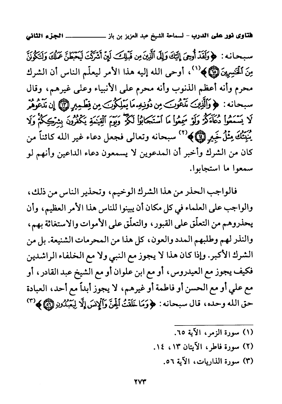 سبحانه: {وَلَقَدْ أُوحِيَ إِلَيْكَ وَإِلَى الَّذِينَ مِنْ قَبْلِكَ لَئِنْ أَشْرَكْتَ لَيَحْبَطَنَّ عَمَلُكَ وَلَتَكُونَنَّ مِنَ الْخَاسِرِينَ} (¬1)، أوحى الله إليه هذا الأمر ليعلم الناس أن الشرك محرم وأنه أعظم الذنوب وأنه محرم على الأنبياء وعلى غيرهم، وقال سبحانه: {وَالَّذِينَ تَدْعُونَ مِنْ دُونِهِ مَا يَمْلِكُونَ مِنْ قِطْمِيرٍ} (¬2) {إِنْ تَدْعُوهُمْ لَا يَسْمَعُوا دُعَاءَكُمْ وَلَوْ سَمِعُوا مَا اسْتَجَابُوا لَكُمْ وَيَوْمَ الْقِيَامَةِ يَكْفُرُونَ بِشِرْكِكُمْ وَلَا يُنَبِّئُكَ مِثْلُ خَبِيرٍ} (¬3) سبحانه وتعالى فجعل دعاء غير الله كائنا من كان من الشرك وأخبر أن المدعوين لا يسمعون دعاء الداعين وأنهم لو سمعوا ما استجابوا.