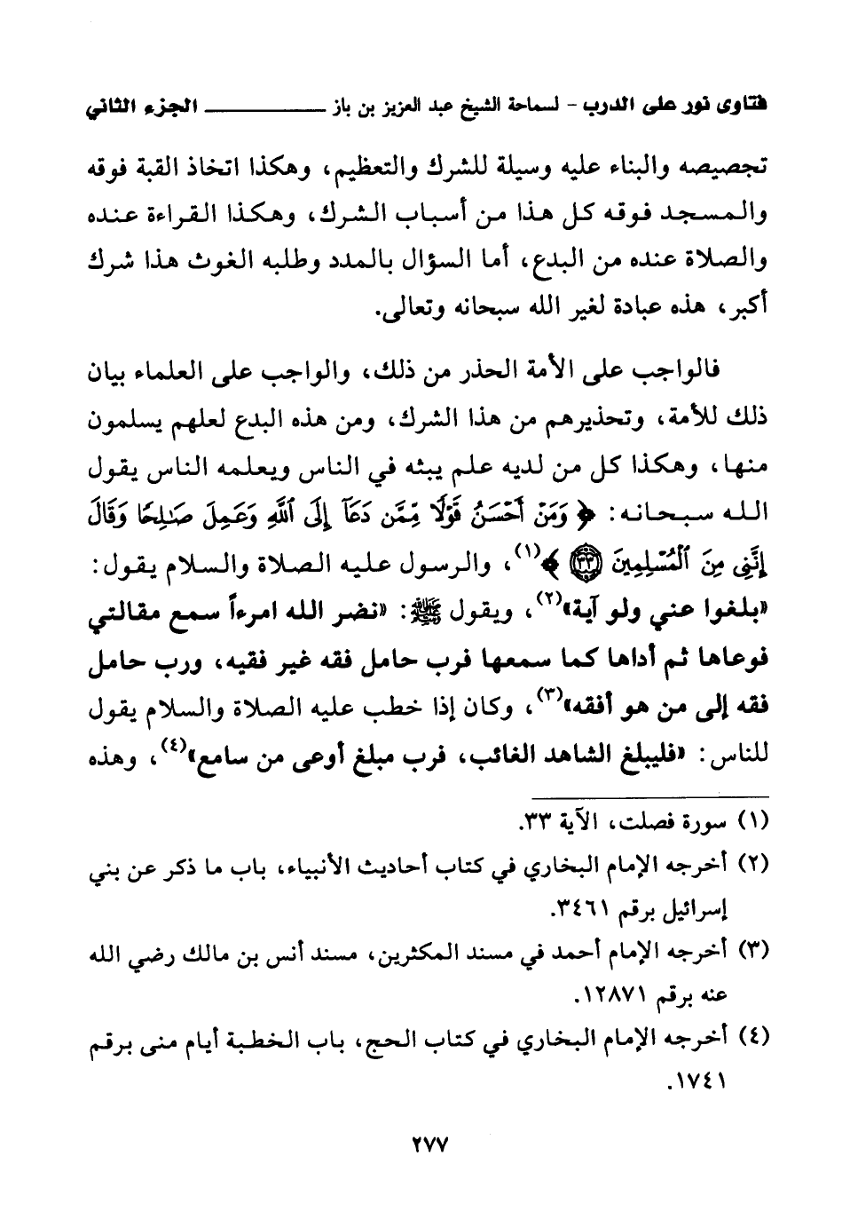 فالواجب على الأمة الحذر من ذلك، والواجب على العلماء بيان ذلك للأمة، وتحذيرهم من هذا الشرك، ومن هذه البدع لعلهم يسلمون منها، وهكذا كل من لديه علم يبثه في الناس ويعلمه الناس يقول الله سبحانه: {وَمَنْ أَحْسَنُ قَوْلًا مِمَّنْ دَعَا إِلَى اللَّهِ وَعَمِلَ صَالِحًا وَقَالَ إِنَّنِي مِنَ الْمُسْلِمِينَ} (¬1)، والرسول عليه الصلاة والسلام يقول: «بلغوا عني ولو آية (¬2)»، ويقول صلى الله عليه وسلم: «نضر الله امرأ سمع مقالتي فوعاها ثم أداها كما سمعها، فرب حامل فقه غير فقيه، ورب حامل فقه إلى من هو أفقه (¬3)»، وكان إذا خطب عليه الصلاة والسلام يقول للناس: «فليبلغ الشاهد الغائب، فرب مبلغ أوعى من سامع (¬4)»، وهذه
