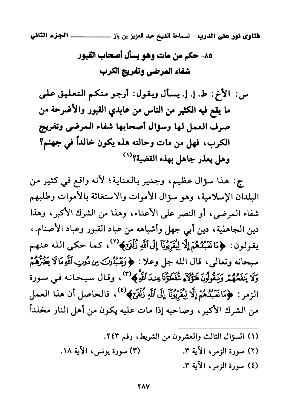 85 - حكم من مات وهو يسأل أصحاب القبور شفاء المرضى وتفريج الكرب