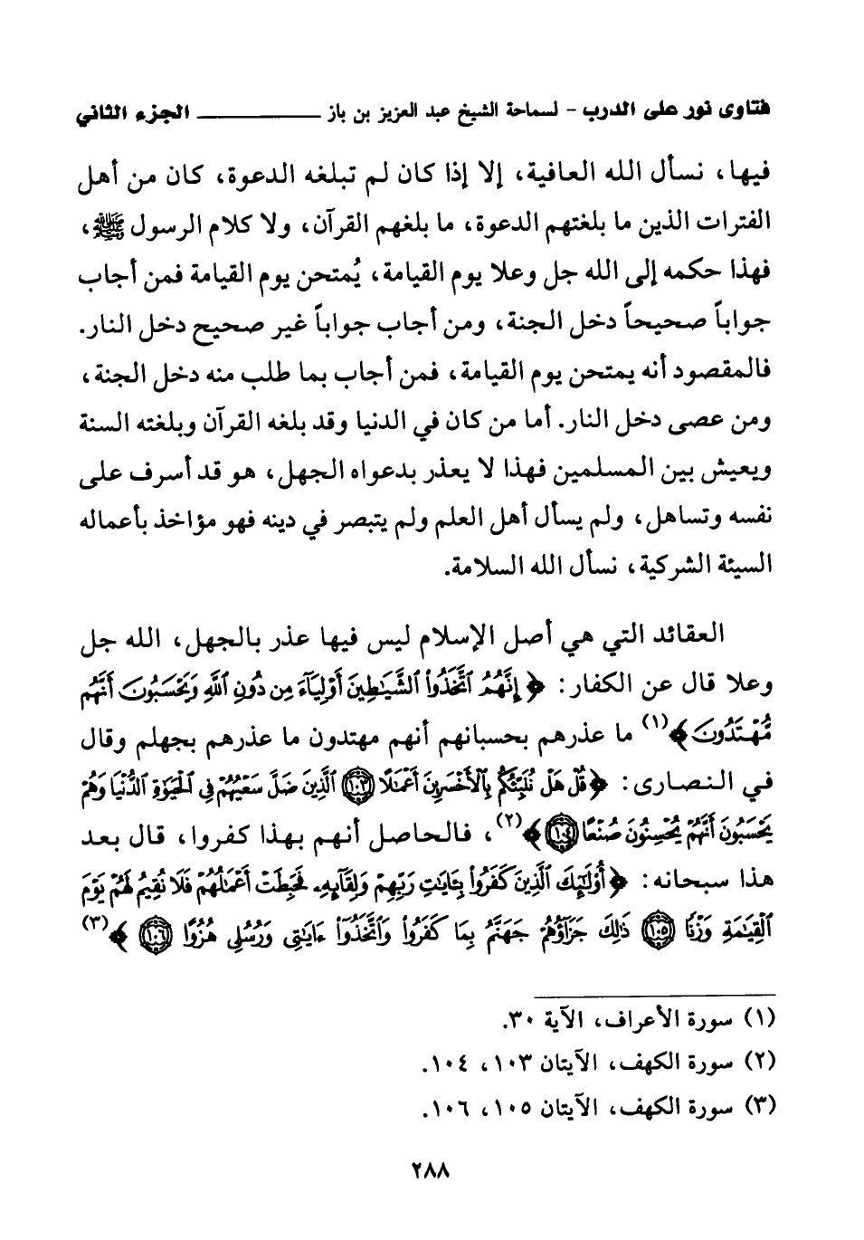 العقائد التي هي أصل الإسلام ليس فيها عذر بالجهل؛ الله جل وعلا قال عن الكفار: {إِنَّهُمُ اتَّخَذُوا الشَّيَاطِينَ أَوْلِيَاءَ مِنْ دُونِ اللَّهِ وَيَحْسَبُونَ أَنَّهُمْ مُهْتَدُونَ} (¬1) ما عذرهم بحسبانهم أنهم مهتدون ما عذرهم بجهلهم وقال في النصارى: {قُلْ هَلْ نُنَبِّئُكُمْ بِالْأَخْسَرِينَ أَعْمَالًا} (¬2) {الَّذِينَ ضَلَّ سَعْيُهُمْ فِي الْحَيَاةِ الدُّنْيَا وَهُمْ يَحْسَبُونَ أَنَّهُمْ يُحْسِنُونَ صُنْعًا} (¬3)، فالحاصل أنهم بهذا كفروا، قال بعد هذا سبحانه: {أُولَئِكَ الَّذِينَ كَفَرُوا بِآيَاتِ رَبِّهِمْ وَلِقَائِهِ فَحَبِطَتْ أَعْمَالُهُمْ فَلَا نُقِيمُ لَهُمْ يَوْمَ الْقِيَامَةِ وَزْنًا} (¬4) {ذَلِكَ جَزَاؤُهُمْ جَهَنَّمُ بِمَا كَفَرُوا وَاتَّخَذُوا آيَاتِي وَرُسُلِي هُزُوًا} (¬5)