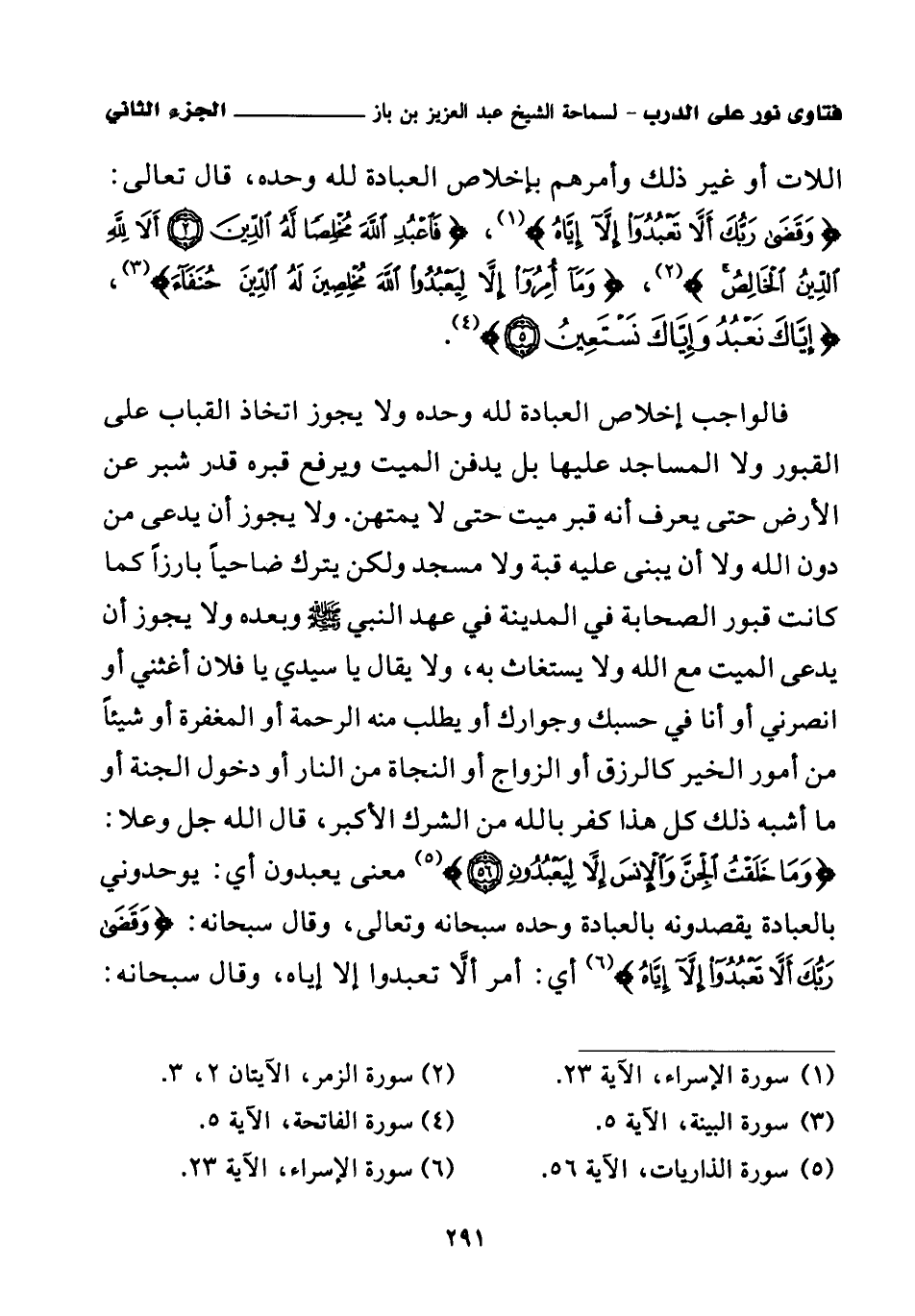 فالواجب إخلاص العبادة لله وحده ولا يجوز اتخاذ القباب على القبور ولا المساجد عليها بل يدفن الميت ويرفع قبره قدر شبر عن الأرض حتى يعرف أنه قبر ميت حتى لا يمتهن، ولا يجوز أن يدعى من دون الله ولا أن يبنى عليه قبة ولا مسجد ولكن يترك ضاحيا بارزا كما كانت قبور الصحابة في المدينة في عهد النبي صلى الله عليه وسلم وبعده ولا يجوز أن يدعى الميت مع الله ولا يستغاث به، ولا يقال يا سيدي يا فلان أغثني أو انصرني أو أنا في حسبك وجوارك أو يطلب منه الرحمة أو المغفرة أو شيئا من أمور الخير كالرزق أو الزواج أو النجاة من النار أو دخول الجنة أو ما أشبه ذلك كل هذا كفر بالله من الشرك الأكبر، قال الله جل وعلا: {وَمَا خَلَقْتُ الْجِنَّ وَالْإِنْسَ إِلَّا لِيَعْبُدُونِ} (¬6) معنى يعبدون أي: يوحدوني بالعبادة يقصدونه بالعبادة وحده سبحانه وتعالى، وقال سبحانه: {وَقَضَى رَبُّكَ أَلَّا تَعْبُدُوا إِلَّا إِيَّاهُ} (¬7) أي: أمر ألا تعبدوا إلا إياه، وقال سبحانه:
