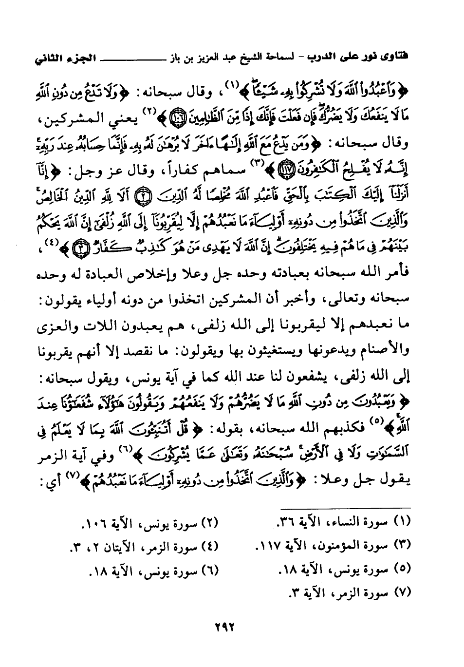 {وَاعْبُدُوا اللَّهَ وَلَا تُشْرِكُوا بِهِ شَيْئًا} (¬1)، وقال سبحانه: {وَلَا تَدْعُ مِنْ دُونِ اللَّهِ مَا لَا يَنْفَعُكَ وَلَا يَضُرُّكَ فَإِنْ فَعَلْتَ فَإِنَّكَ إِذًا مِنَ الظَّالِمِينَ} (¬2) يعني المشركين، وقال سبحانه: {وَمَنْ يَدْعُ مَعَ اللَّهِ إِلَهًا آخَرَ لَا بُرْهَانَ لَهُ بِهِ فَإِنَّمَا حِسَابُهُ عِنْدَ رَبِّهِ إِنَّهُ لَا يُفْلِحُ الْكَافِرُونَ} (¬3) سماهم كفارا، وقال عز وجل: {إِنَّا أَنْزَلْنَا إِلَيْكَ الْكِتَابَ بِالْحَقِّ فَاعْبُدِ اللَّهَ مُخْلِصًا لَهُ الدِّينَ} (¬4) {أَلَا لِلَّهِ الدِّينُ الْخَالِصُ وَالَّذِينَ اتَّخَذُوا مِنْ دُونِهِ أَوْلِيَاءَ مَا نَعْبُدُهُمْ إِلَّا لِيُقَرِّبُونَا إِلَى اللَّهِ زُلْفَى إِنَّ اللَّهَ يَحْكُمُ بَيْنَهُمْ فِي مَا هُمْ فِيهِ يَخْتَلِفُونَ إِنَّ اللَّهَ لَا يَهْدِي مَنْ هُوَ كَاذِبٌ كَفَّارٌ} (¬5)، فأمر الله سبحانه بعبادته وحده جل وعلا وإخلاص العبادة له وحده سبحانه وتعالى، وأخبر أن المشركين اتخذوا من دونه أولياء يقولون: ما نعبدهم إلا ليقربونا إلى الله زلفى، هم يعبدون اللات والعزى والأصنام ويدعونها ويستغيثون بها ويقولون: ما نقصد إلا أنهم يقربونا إلى الله زلفى، يشفعون لنا عند الله كما في آية يونس، ويقول سبحانه: {وَيَعْبُدُونَ مِنْ دُونِ اللَّهِ مَا لَا يَضُرُّهُمْ وَلَا يَنْفَعُهُمْ وَيَقُولُونَ هَؤُلَاءِ شُفَعَاؤُنَا عِنْدَ اللَّهِ} (¬6) فكذبهم الله سبحانه، بقوله: {قُلْ أَتُنَبِّئُونَ اللَّهَ بِمَا لَا يَعْلَمُ فِي السَّمَاوَاتِ وَلَا فِي الْأَرْضِ سُبْحَانَهُ وَتَعَالَى عَمَّا يُشْرِكُونَ} (¬7) وفي آية الزمر يقول جل وعلا: {وَالَّذِينَ اتَّخَذُوا مِنْ دُونِهِ أَوْلِيَاءَ مَا نَعْبُدُهُمْ} (¬8) أي: